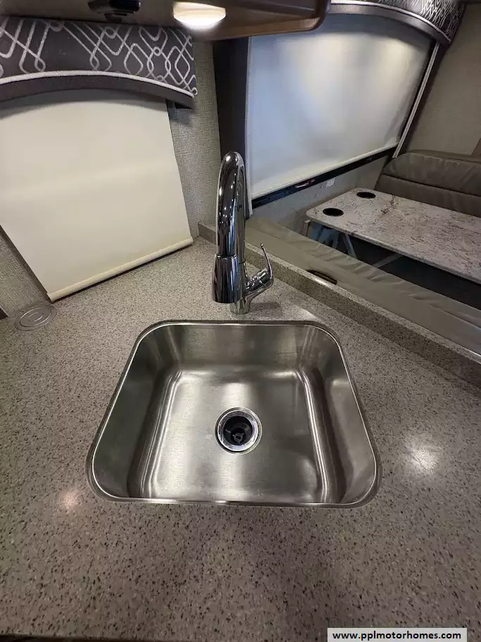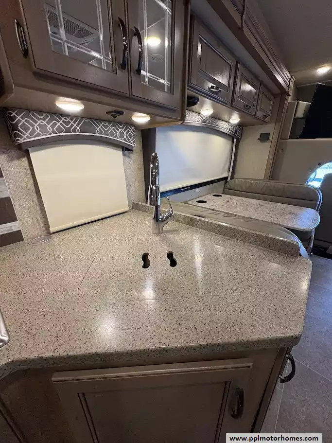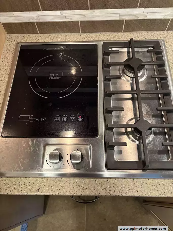 The kitchen is a mid-ship galley designed for high-capacity family use, featuring residential-style amenities and integrated storage. The three-burner cook top includes 1 True Induction burner and 2 gas burners. There is also a microwave, double door refrigerator, a single bowl stainless steel sink and a pop-up countertop outlet.