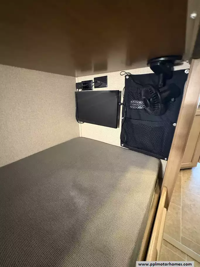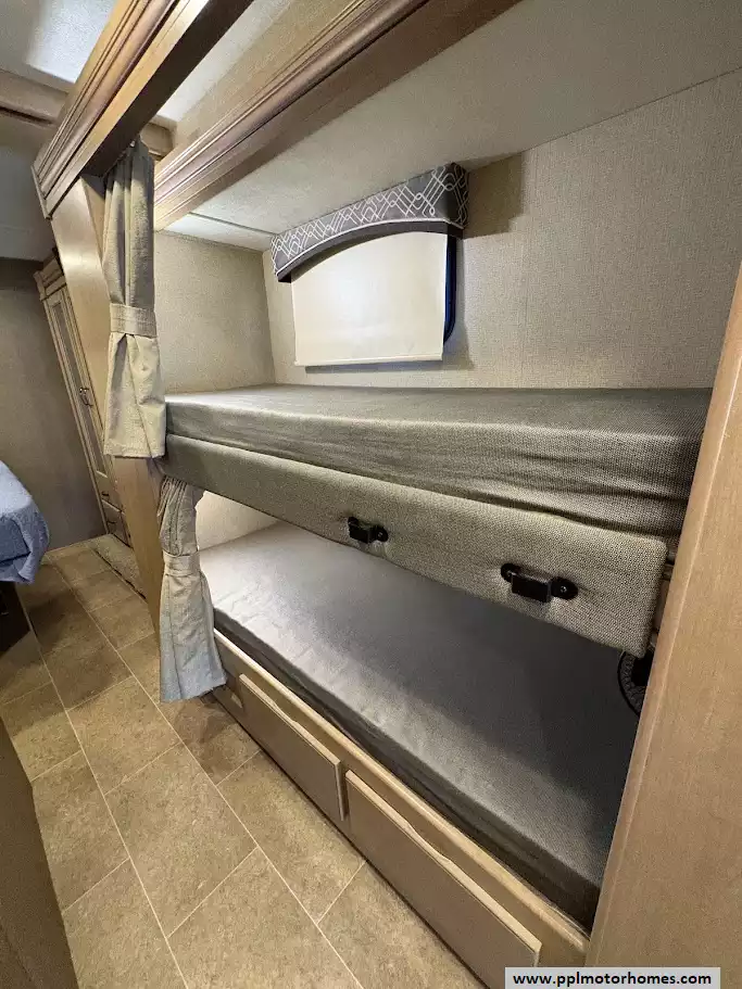 The primary living space is designed for both group relaxation and high sleeping capacity. A leatherette booth located on the roadside slide-out and can be converted into a sleeping area. A leatherette sofa that sits adjacent to the dinette can also converts into a bed. A large sleeping area above the cockpit with a 500-lb capacity, featuring a telescoping ladder and a child safety net. The bunk beds are permanently integrated into the coach's full-wall slide-out, ensuring they are accessible even when the slide is retracted. Each bunk is equipped with its own 15.5-inch TV with a built-in DVD player as a standard feature in the bunk bed area.