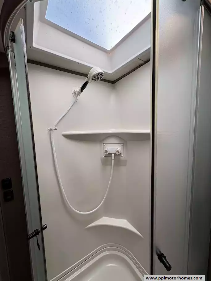 The rear master bedroom is a private suite located at the back of the coach, benefiting from the extension of the full-wall slide-out. Storage includes a built-in wardrobe and overhead storage cabinets above the headboard. The bathroom features a dual-entry design, allowing direct access from the master bedroom.