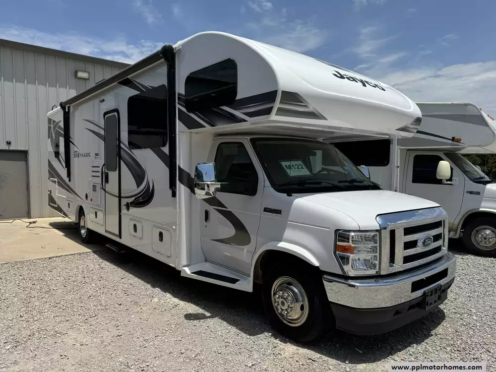 This 2021 Jayco Greyhawk 30X has a 7.3l Ford Engine On a Ford 450 Chassis, 1 Slide-out, Onan Gas Generator, 2 Ducted Air Conditioners, Levelers, Double Door Gas/110v Norcold Refrigerator, Automatic Main Awning And Window/Door Awnings, Backup Camera, GPS System, Heated Tanks, Outside Speakers, 2 TVs, Outside Shower, Microwave, 3 Burner Range, Oven, Frameless, tinted windows, Electric patio awning with LED lights, Tire pressure monitoring system, Blackout night roller shades, Carbon Monoxide detector, 84 in. interior ceiling height with padded vinyl ceiling, Jayco-exclusive, easy operation legless dinette table and a max sleeping count of 8 with 1 full size bed, 1 queen bed, and 2 convertible/sofa beds. Ask about PPL's convenient financing options!