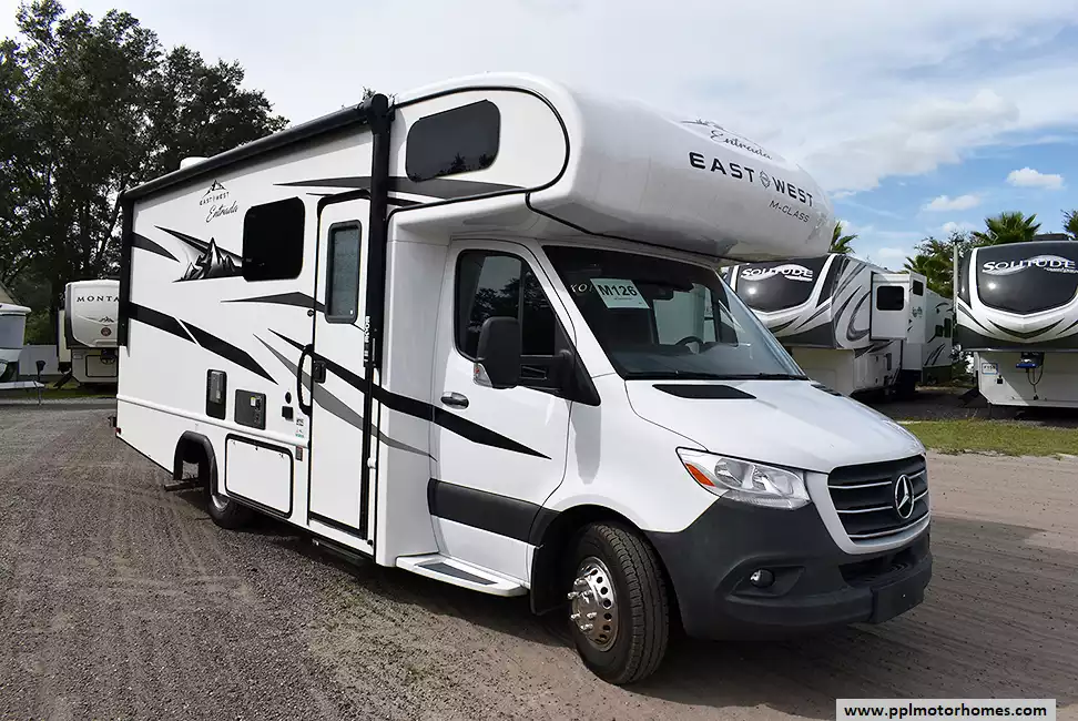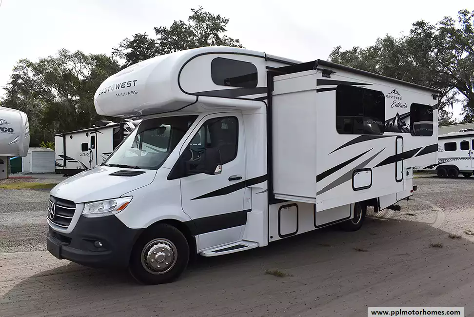 This 2022 Entrada 24FM has a V6 Mercedes Benz Engine On a Sprinter Chassis, 1 Slide-out, Propane Generator, 1 Ducted Air Conditioner, Levelers, Double Door 12v Magic Chef Refrigerator, Automatic Main Awning And Slide Awning, Backup Camera, GPS System, Solar Panel, Heated Tanks, Satellite Receiver, TV, Convection Microwave, 3 Burner Range