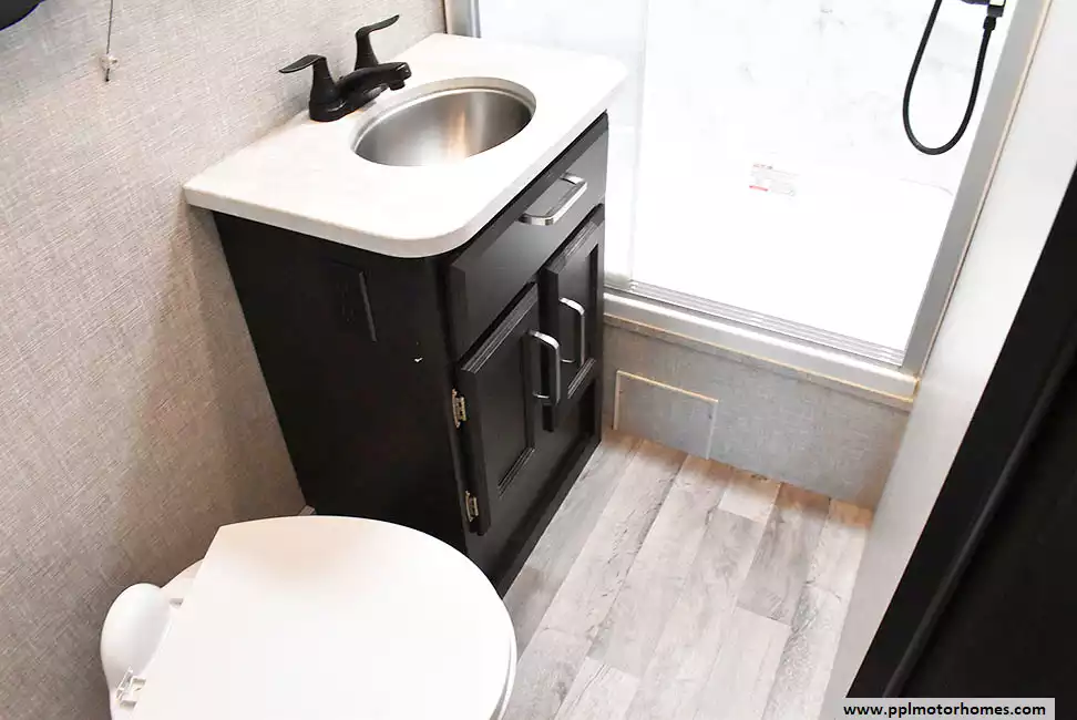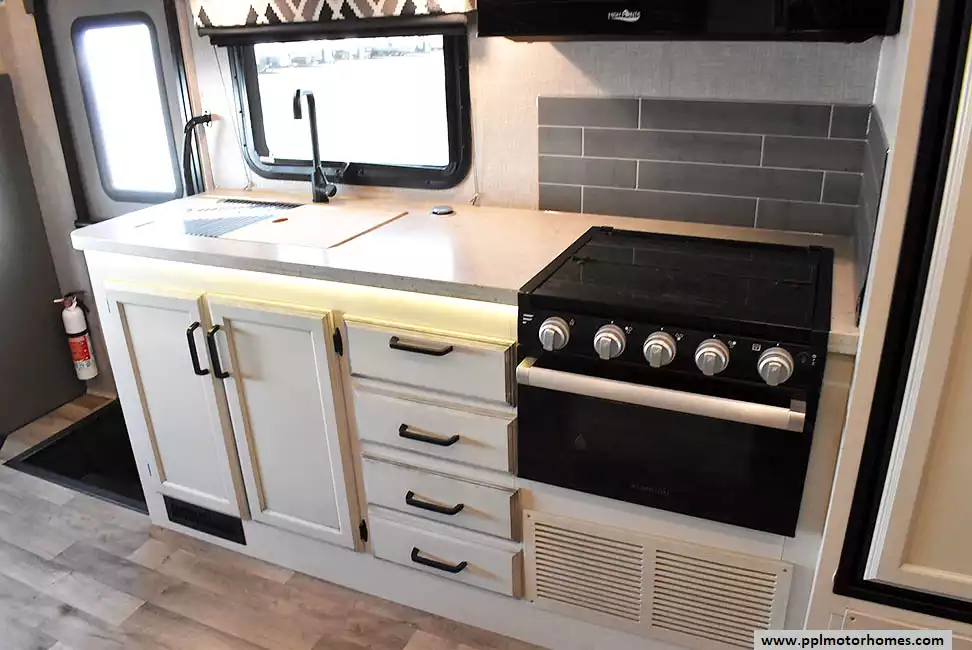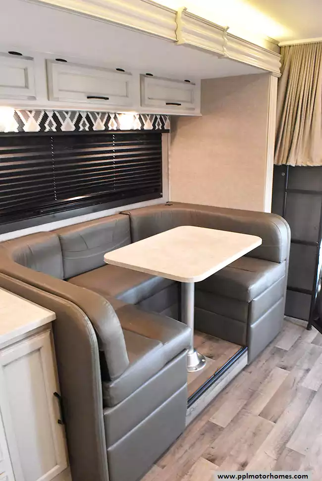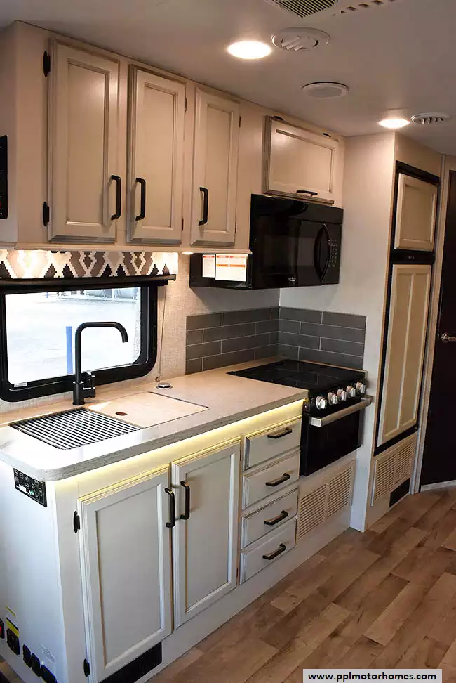 The smart floorplan includes a spacious living area, fully equipped kitchen with ample counter space, refrigerator, microwave, and three-burner cooktop. Enjoy meals at the dinette and relax in the comfortable seating area after a day of adventure.