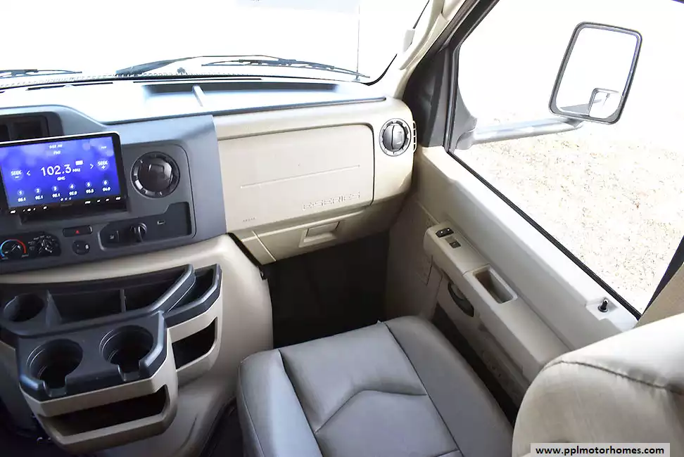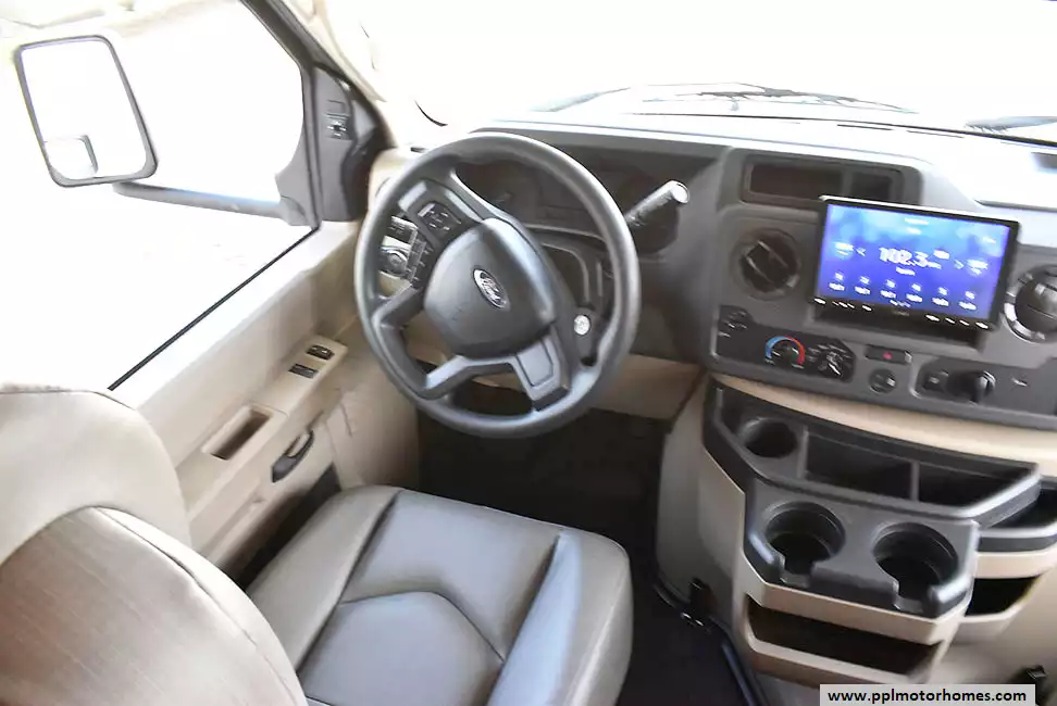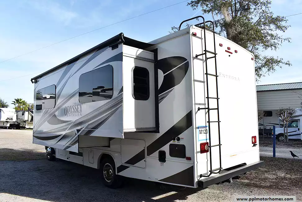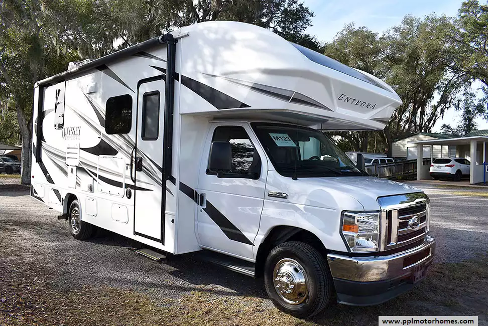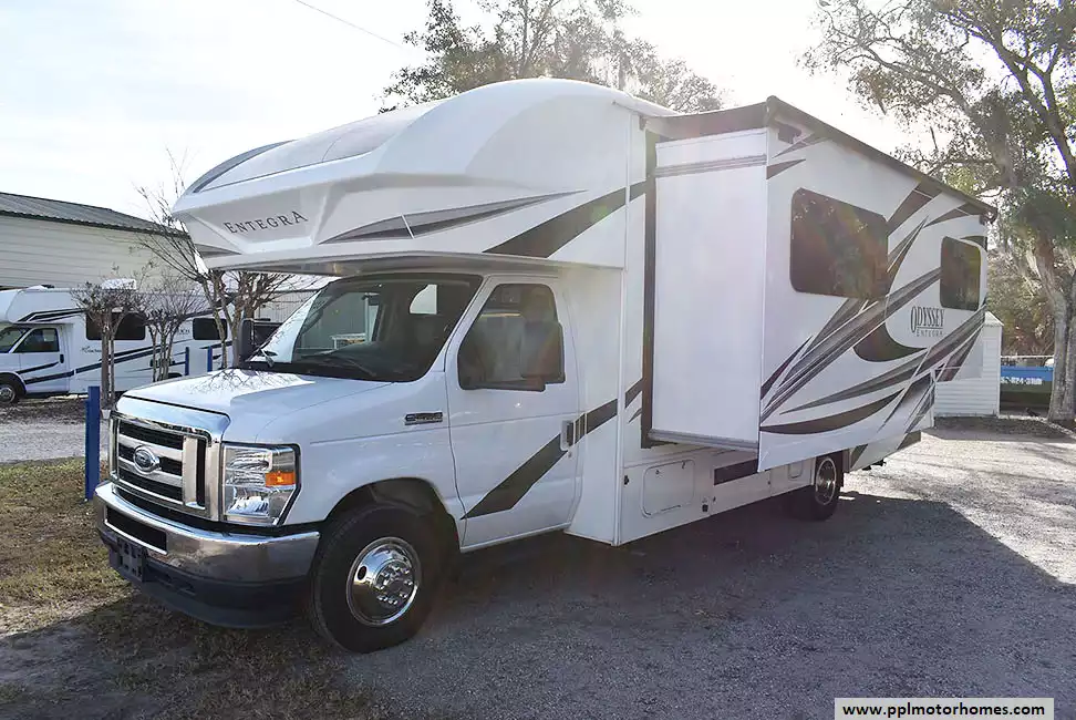 This 2022 Odyssey 24B has a 7.3 Ford Engine On a Ford Chassis, 1 Slide-out, Onan Gas Generator, 1 Ducted Air Conditioner, Double Door Gas/110v Norcold Refrigerator, Automatic Main Awning, Backup Camera, GPS System, Heated Tanks, Satellite Receiver, Outside Entertainment System, 3 TVs, Satellite Radio, Outside Shower, Microwave, 3 Burner Range, Oven