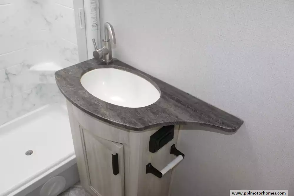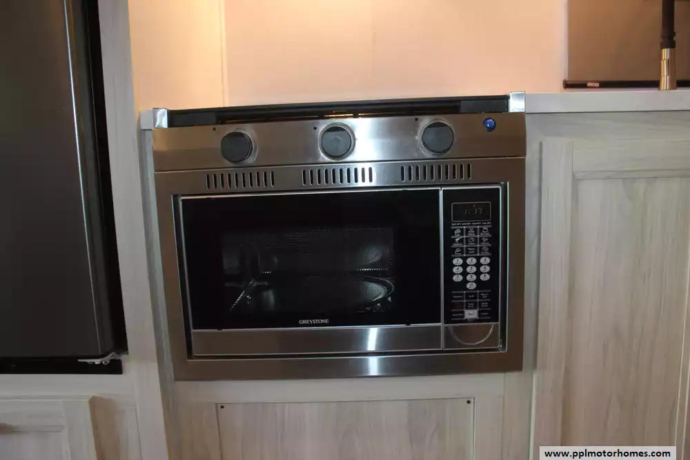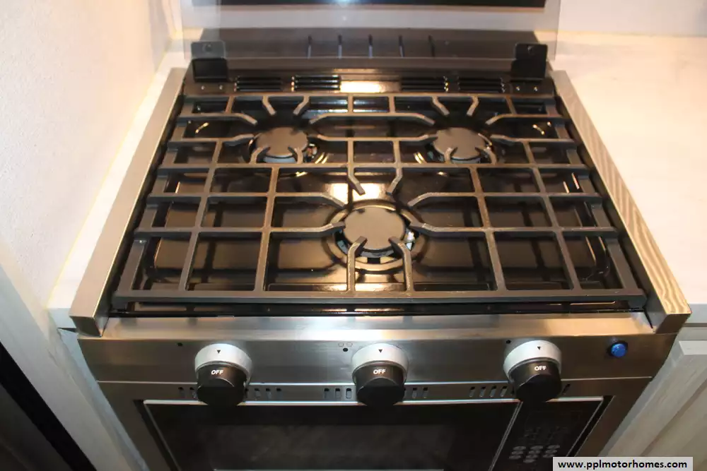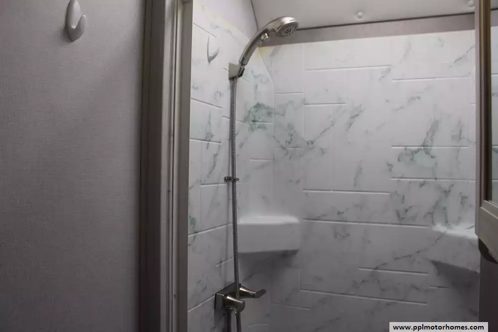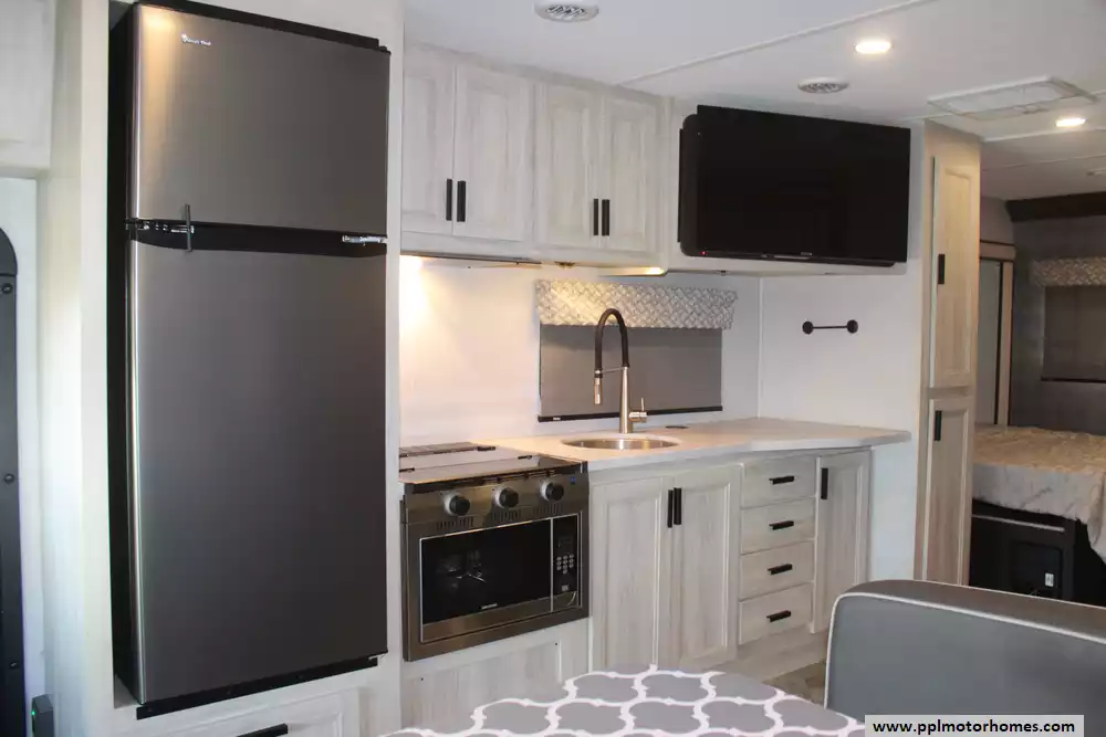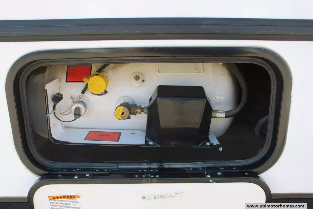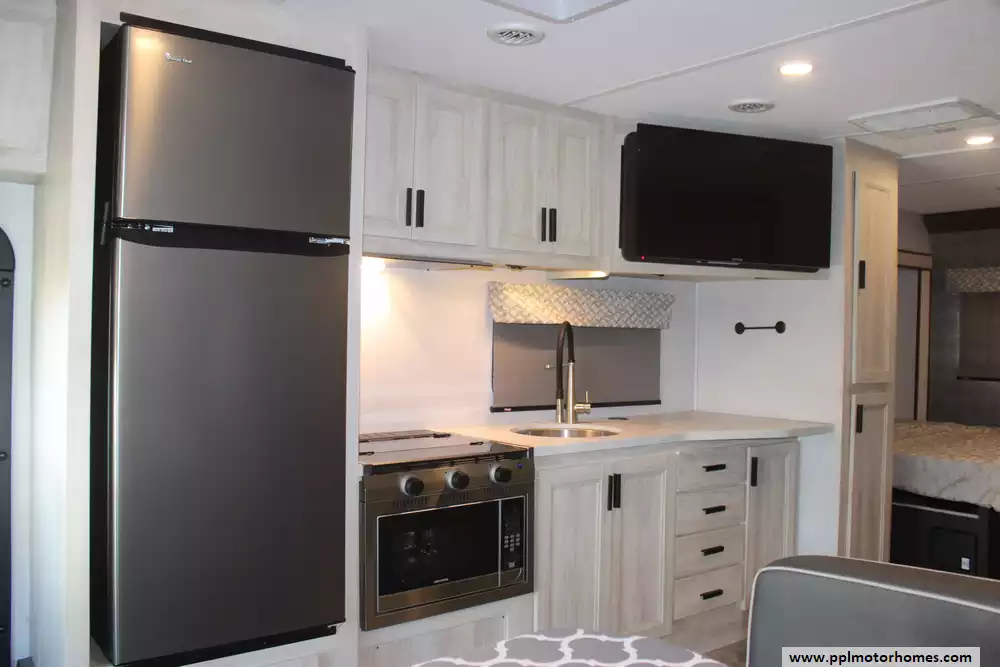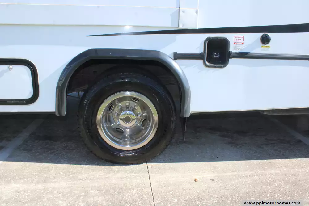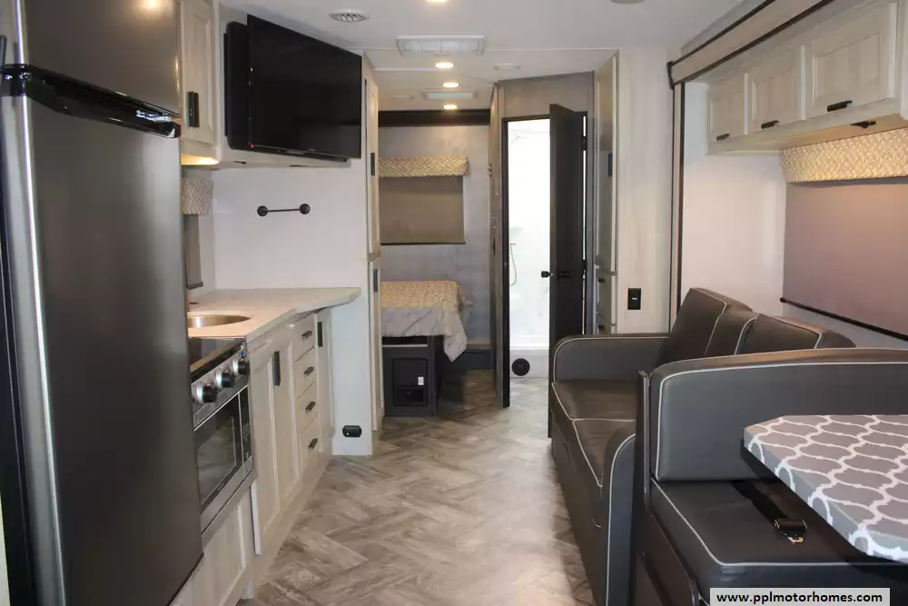 Specs: Length: 29.4 ft., Width: 8.42 ft., Height: 11.4 ft., Interior Height: 6.3 ft., Fuel Capacity: 55 gal., Total Fresh Water Tank Capacity: 44 gal., Total Grey Tank Capacity: 33 gal., Total Black Water Tank Capacity: 32 gal., Total Propane Tank Capacity: 41 lbs.