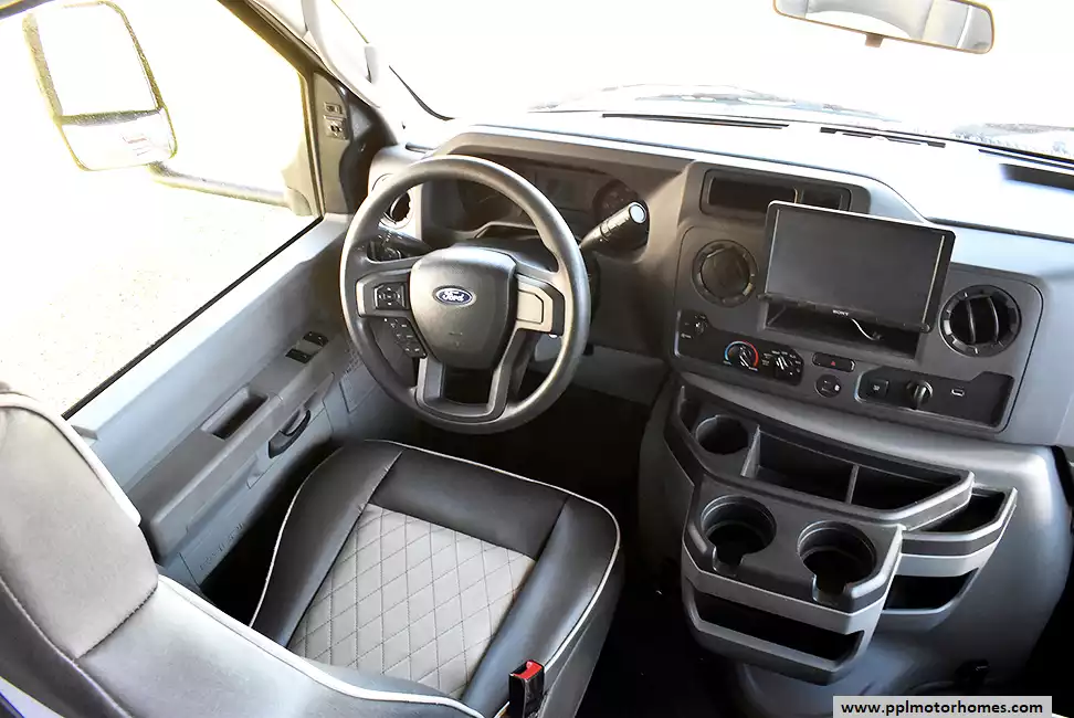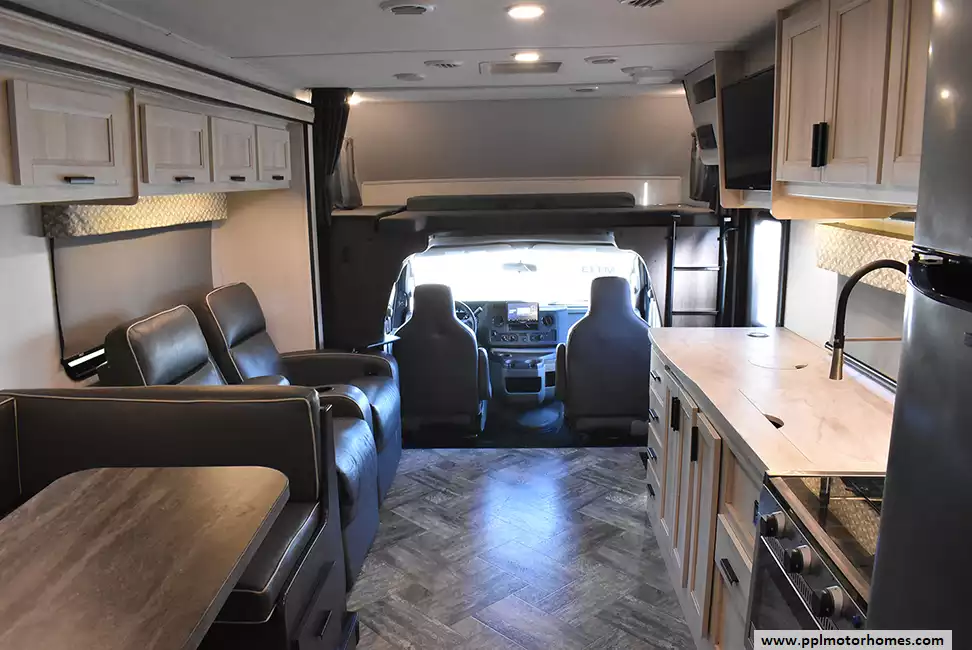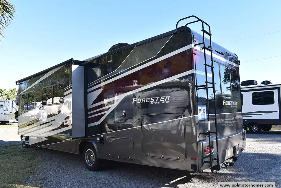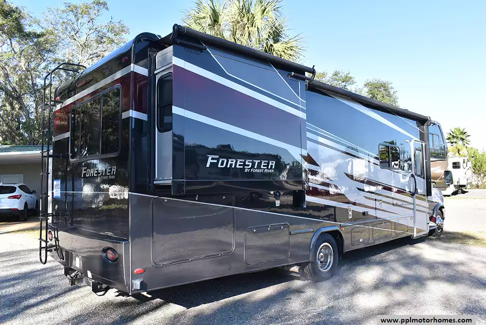 This 2022 Forester 3011 has a V10 Ford Engine On a Ford 450 Chassis, 2 Slide-outs, Onan Gas Generator, 2 Ducted Air Conditioners, Levelers, Double Door 110v/12v Magic Chef Refrigerator, Automatic Main Awning, Backup Camera, GPS System, Solar Panel, Heated Tanks, Satellite Receiver, Outside Entertainment System, 2 TVs, Outside Shower, Convection Microwave, 3 Burner Range