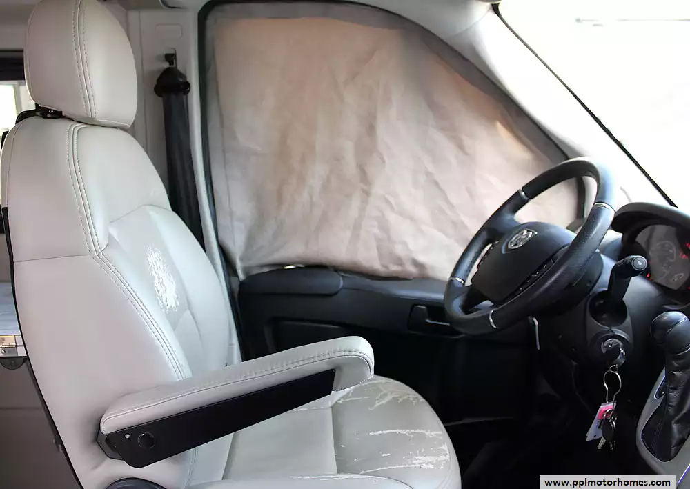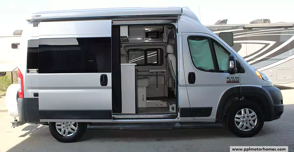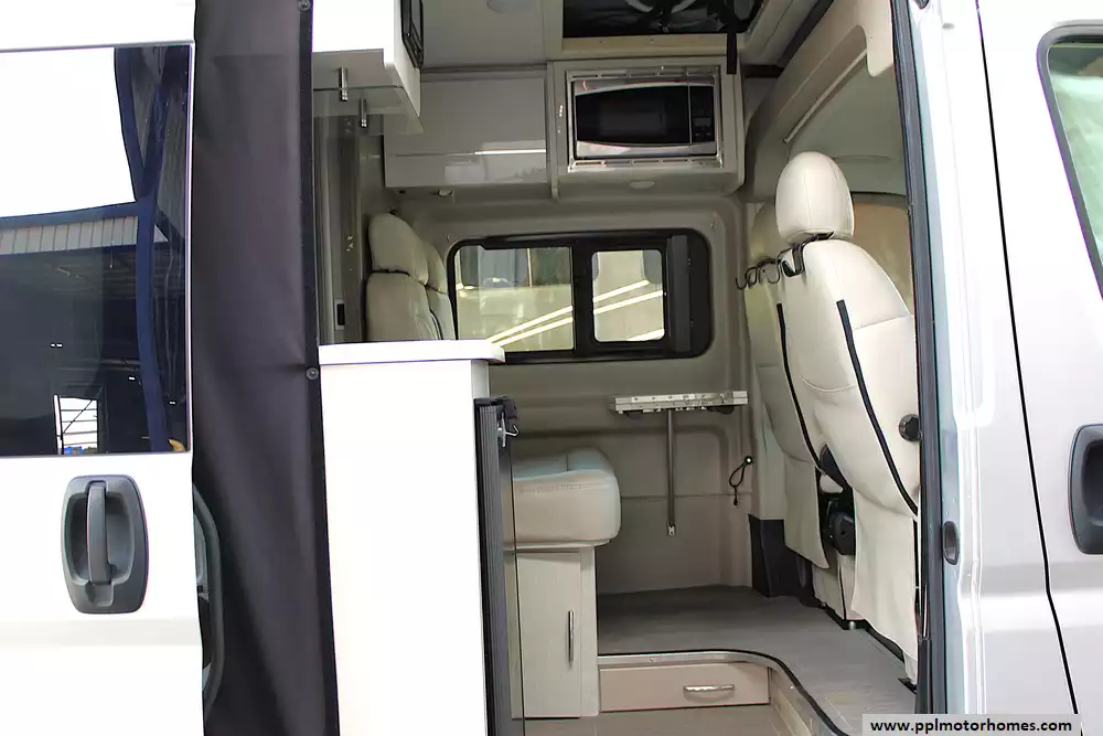 Additional features include a power awning, solar panel with charge controller, exterior LP connection for grilling, rear rinse station, side entry step, screen door, and optional bike rack capability--making it ready for outdoor adventures. This unit is also equipped with heating and hot water systems, onboard batteries, and generator prep or options depending on configuration. Please note, this RV is priced accordingly due to cosmetic wear on the front captain's chairs, which are peeling, but it still offers excellent value for someone looking for a fully equipped, easy-to-drive camper van with all the essentials already built in.