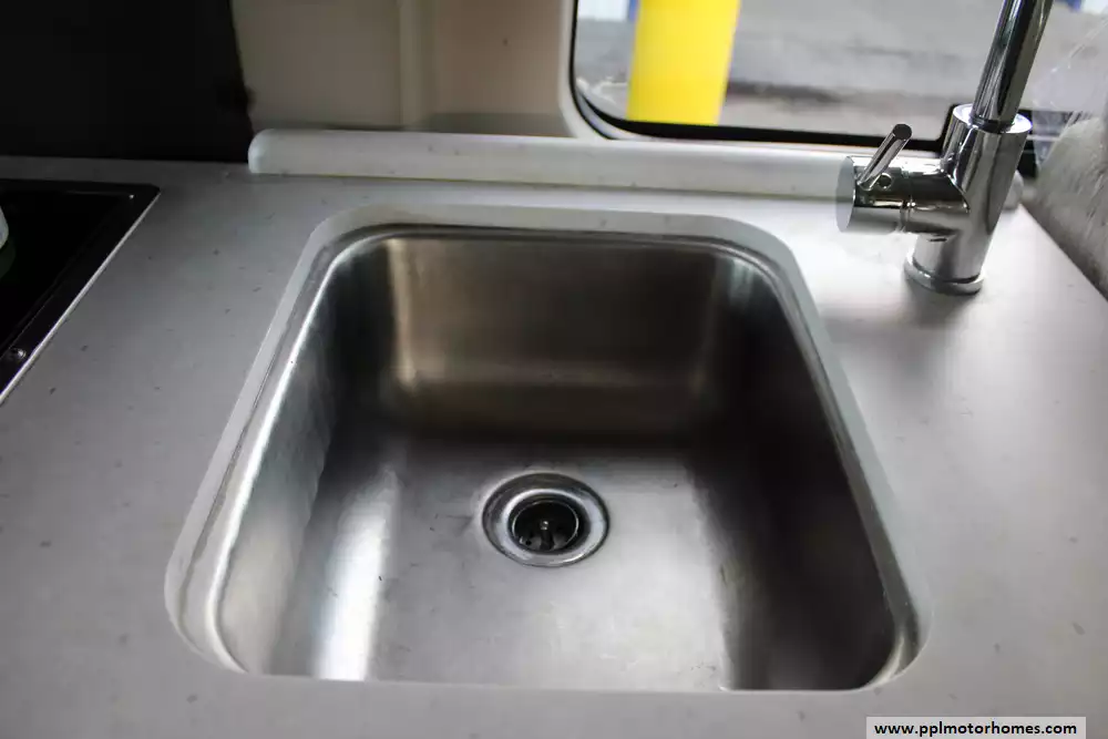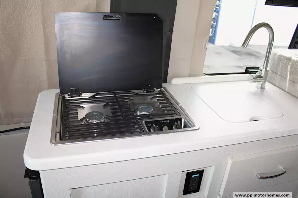 Inside, the Rize 18A is designed to maximize space and functionality. The swivel front captain's chairs open up the living area, while the convertible sofa easily turns into a comfortable sleeping space for 2 people. The kitchen is fully equipped with a 2-burner cooktop, sink, refrigerator, pressed countertops, and overhead cabinetry for storage. You'll also find premium features like residential-style vinyl flooring, Euro-style cabinet doors, window privacy shades, and LED lighting throughout. The rear wet bath includes a toilet and shower, giving you full bathroom capability in a compact footprint, along with fresh, gray, and black water tank systems for off-grid use.