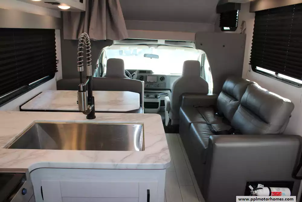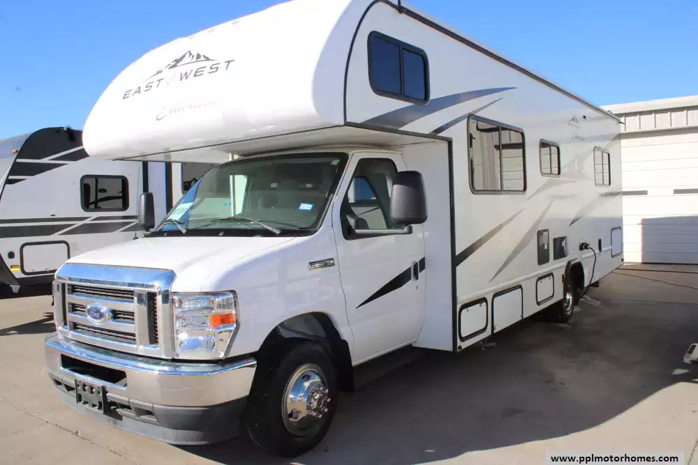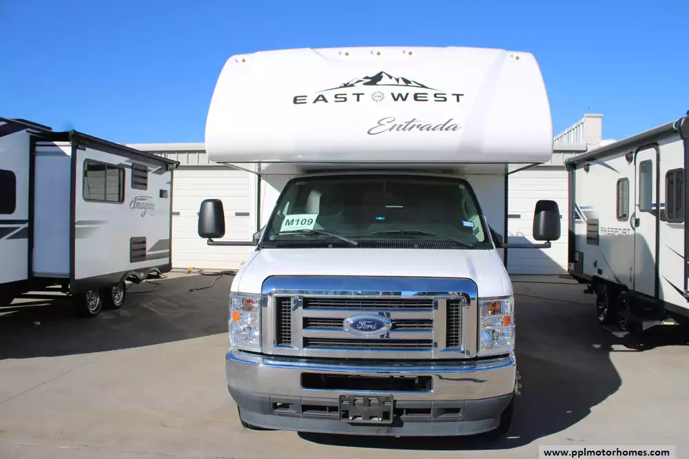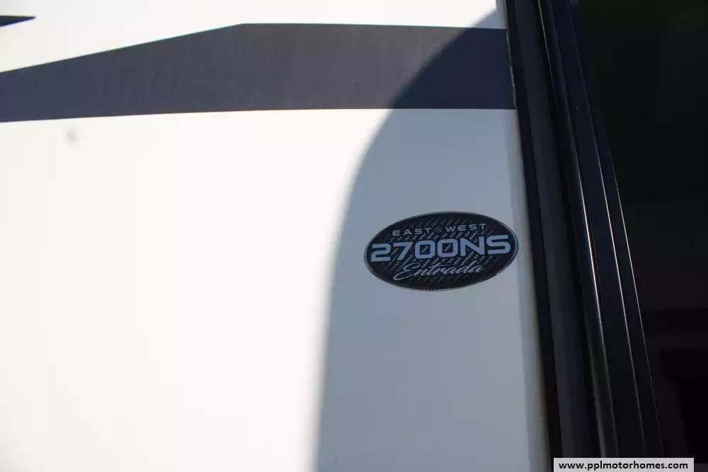 The 2023 East to West Entrada 2700NS is a 29-foot-11-inch Class C gas motorhome built on a Ford chassis, with a GVWR of 12,500 lbs (and in some listings up to 14,500 lbs) and a 55-gallon fuel capacity. Designed for comfort and durability, it features a walk-around queen bed in a rear private bedroom, a 60" x 80" bunk over the cab, a sofa and a 42"x68" booth dinette, and a well-equipped kitchen with a 10.7-cu-ft 12 V refrigerator and convection microwave. It also boasts premium construction elements like 2-inch Azdel composite sidewalls, a one-piece molded fiberglass front cap, and a power awning with LED lighting. This model features the optional 200-watt solar package and 4-point hydraulic leveling system. Honorable mentions include 12v heated tanks, rear and side cameras, black tank flush, and 5,000-lb hitch capacity. Enjoy your travels!