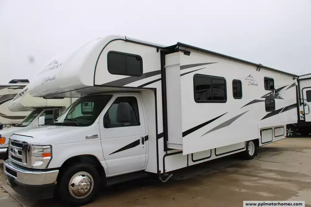 The 2023 East To West Entrada 3100FB is a spacious Class C motorhome designed for families and groups seeking comfort and convenience on the road. Built on the Ford E-450 chassis with a 7.3L V8 engine, it offers a smooth driving experience. The floorplan features a full-wall slide-out on the driver's side, expanding the living area and accommodating a set of bunk beds and a 60" x 80" cab-over bunk. The rear master suite includes a walk-around RV queen bed and provides private access to the dual-entry bathroom. Entertainment is provided by a 40" 12V LED swing-arm TV, with additional prep for a second TV in the bedroom. Exterior amenities include an 18-foot power awning with LED lighting, a 7,500 lb. hitch, 2 Roof A/Cs, and a 5.5kW NPS Yamaha generator. The Entrada 3100FB is constructed with Azdel composite sidewalls, a one-piece molded fiberglass front cap, and a brand-new roof membrane. Additional features include 12V tank heaters, Winegard Air 360+ antenna, and backup and sideview cameras with a monitor for enhanced safety. Enjoy your adventures in this Entrana bunk model! Eligible for PPL's financing options.