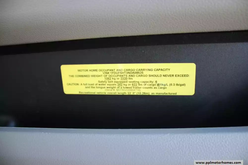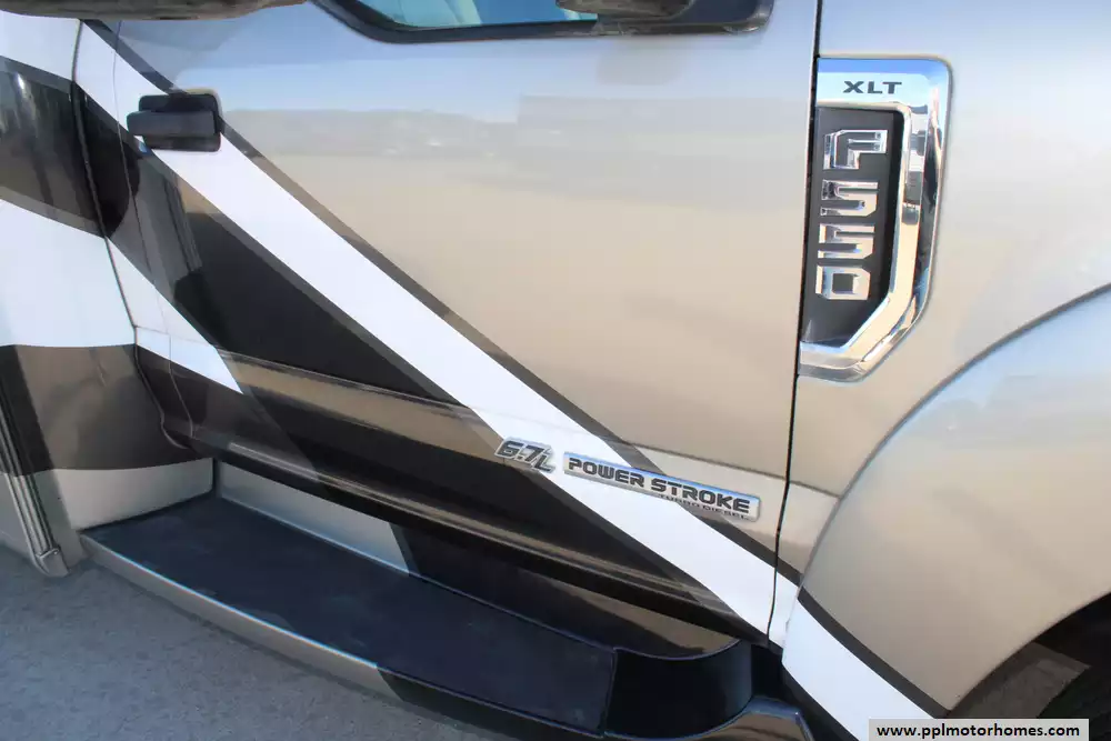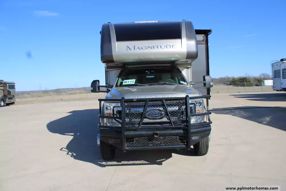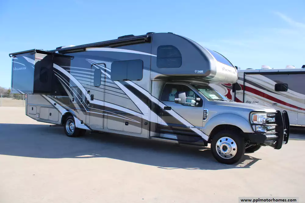 The 2023 Thor Motor Coach Magnitude XG32 is a robust diesel-powered Super C Class C motorhome built on a Ford F-550 chassis with a 6.7 L Power Stroke V8 turbo diesel engine producing around 330 hp and 825 lb-ft of torque paired to a 10-speed automatic, giving it strong performance and towing capability. It measures about 33' 8" long with two slide-outs and comfortably sleeps up to six, featuring a queen bed, overhead bunk, convertible dinette and theater seating, along with residential comforts like a full kitchen with residential refrigerator and convection microwave, large living area TV, tankless water heater, and generous storage. Exterior features include full body paint, automatic leveling jacks, a power patio awning with integrated LED lighting, frameless windows, and a robust construction with Vacu-Bond laminated roof and walls; the coach also offers premium tech like touchscreen infotainment and a 3-camera monitoring system. Let the adventures begin!