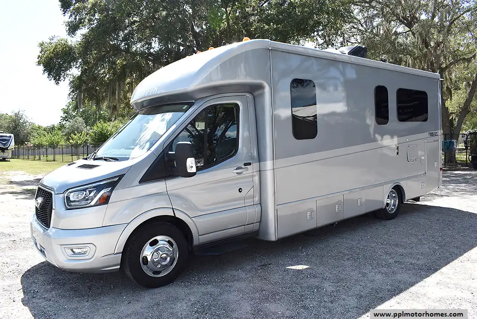 This 2023 Midas 24RT has a V6 Ford Engine On a Ford Chassis, Onan Gas Generator, Double Door Gas/110v Norcold Refrigerator, Automatic Main Awning, Backup Camera, Solar Panel, 2 TVs, Outside Shower, 1 Burner Range