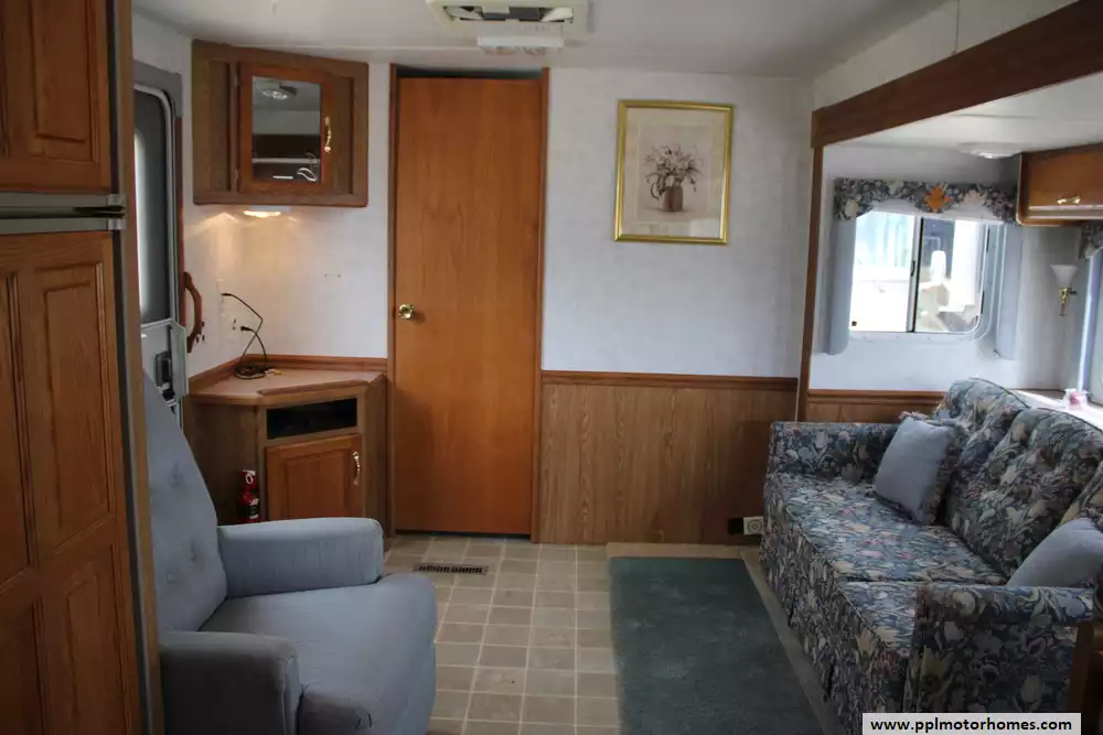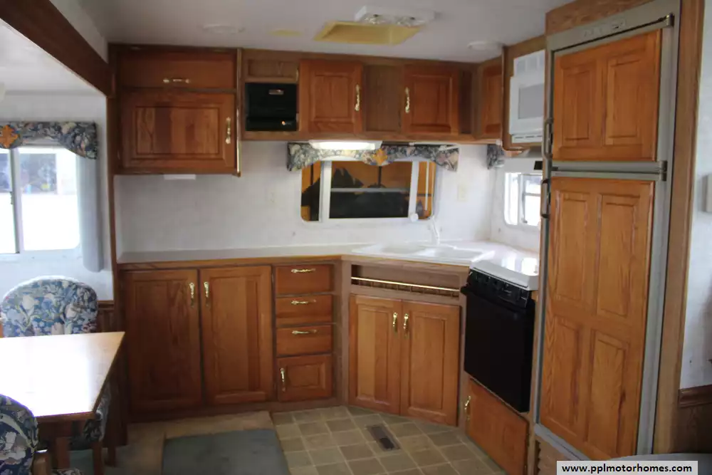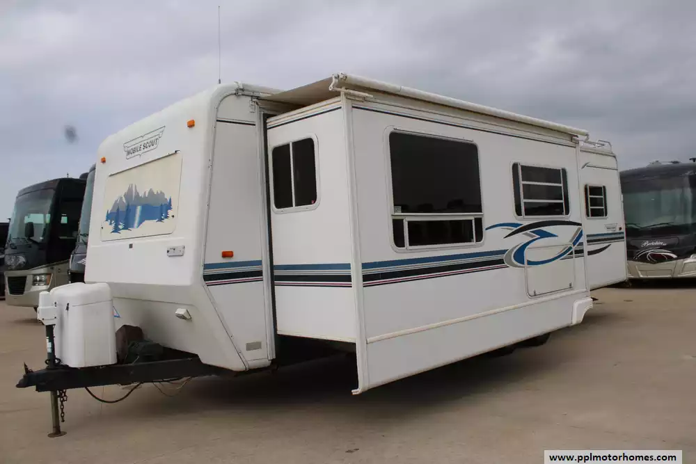 The 2002 SunnyBrook Mobile Scout 30FKS is a well-built travel trailer designed for extended trips, offering a spacious front-kitchen (FKS) floorplan and measuring just over 30 feet in length with a tandem-axle setup for improved stability on the road. Built with a durable aluminum frame, rubber roof, and quality hardwood cabinetry, it emphasizes solid construction and attention to detail throughout.