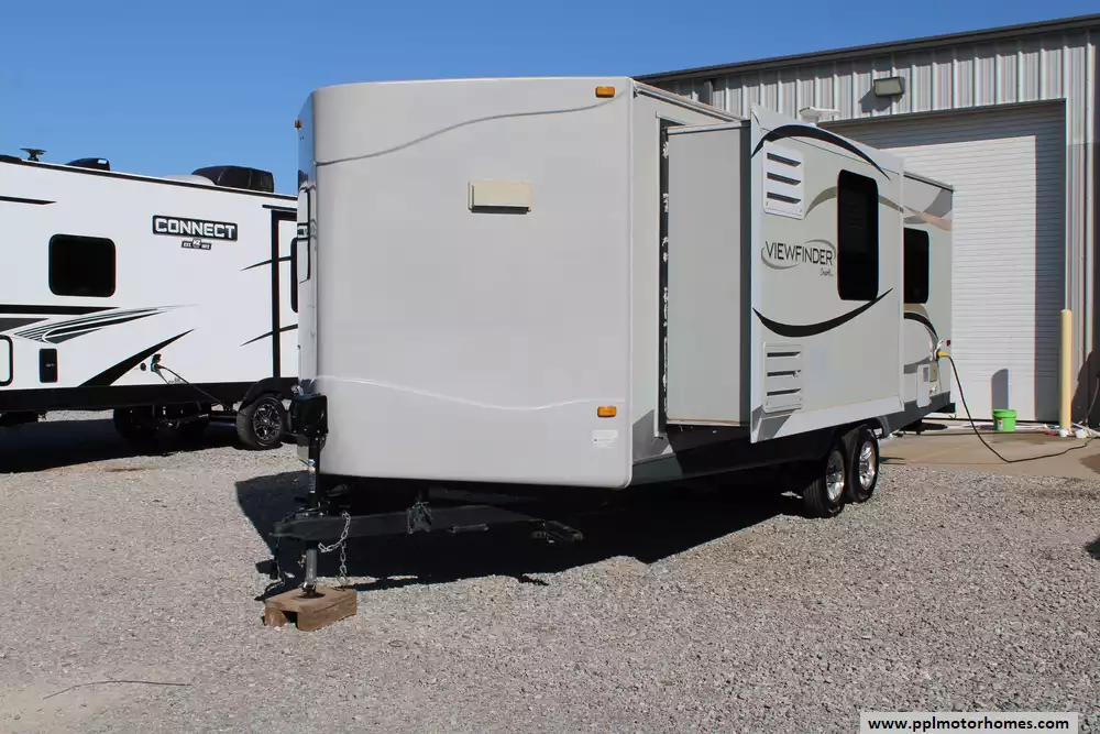 This 2010 Viewfinder 24FK has an Electric Tongue Jack, 1 Slide-out, 1 Ducted Air Conditioner, Double Door Gas/110v/12v Dometic Refrigerator, Outside Speakers, TV, Microwave, 3 Burner Range, Oven