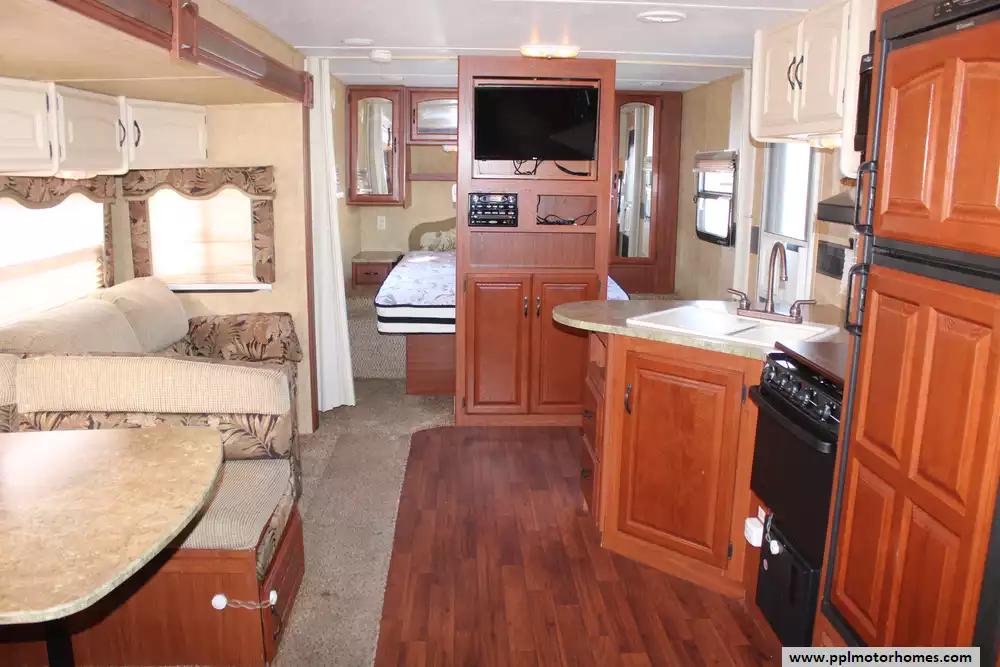 Specs: Length: 32.8 ft., Width: 8 ft., Height: 10.11 ft., Payload Capacity: 1,440 lbs., Total Fresh Water Tank Capacity: 50 gal., Total Gray Water Tank Capacity: 60 gal., Total Black Water Tank Capacity: 30 gal., Total Propane Tank Capacity: 60 lbs.