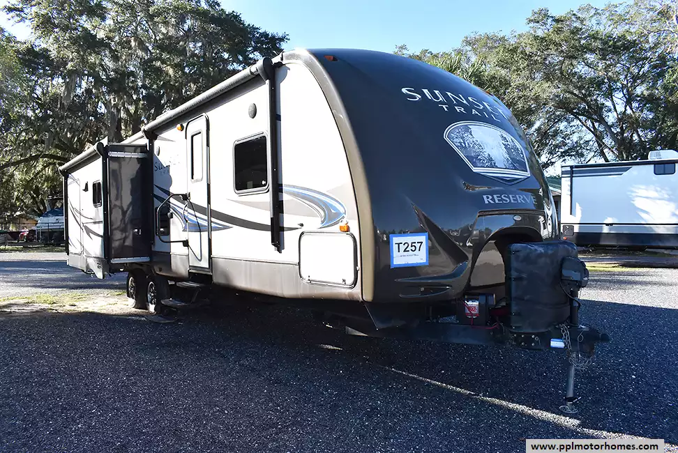 This 2013 Sunset Trail 32RL has an Electric Tongue Jack, 3 Slide-outs, 1 Ducted Air Conditioner, Double Door Gas/12v Norcold Refrigerator, Automatic Main Awning, Outside Entertainment System, TV, DVD Player, Outdoor Grill, Outdoor Kitchen, Outside Shower, Fireplace, Microwave, 3 Burner Range, Oven