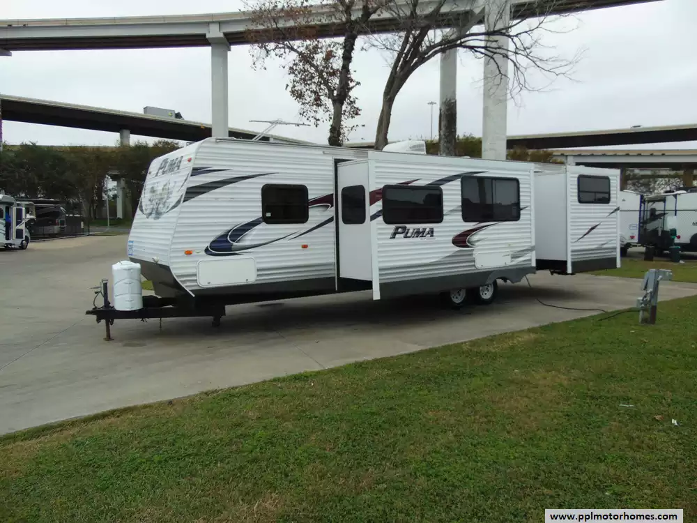 This 2013 Palomino Puma 31KBH is a spacious travel trailer tailored for families and large groups, offering a well-thought-out design and family-friendly amenities.It delivers comfort and functionality while remaining towable by many heavy-duty vehicles. Features Include...2 Slide-outs, 1 Ducted Air Conditioner, Double Door Gas/110v Dometic Refrigerator, Automatic Main Awning, Outside Speakers, TV, Outdoor Kitchen, Outside Shower, Microwave, 3 Burner Range,and Oven.With its family-oriented layout,ample sleeping capacity,and convenient features,this is an excellent choice for families looking for a comfortable and versatile travel trailer.