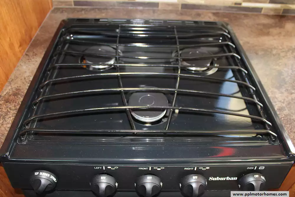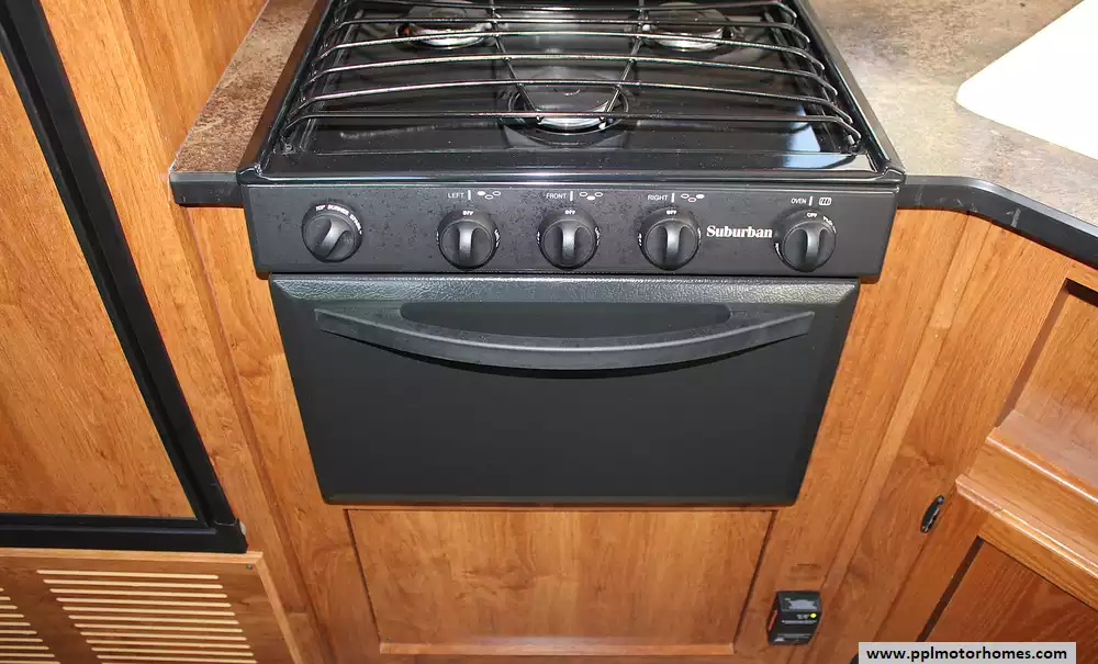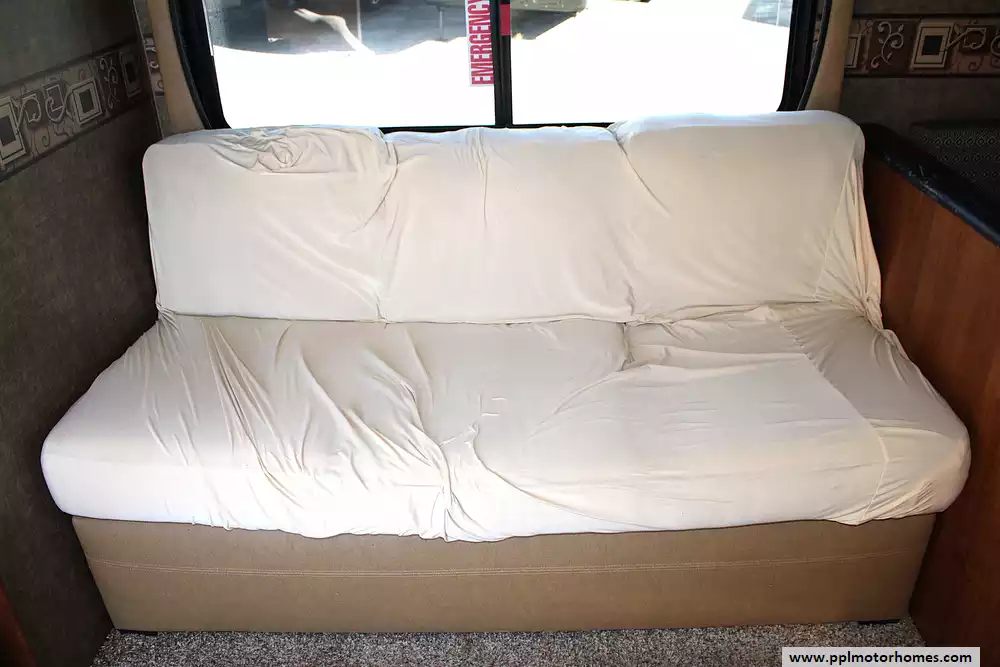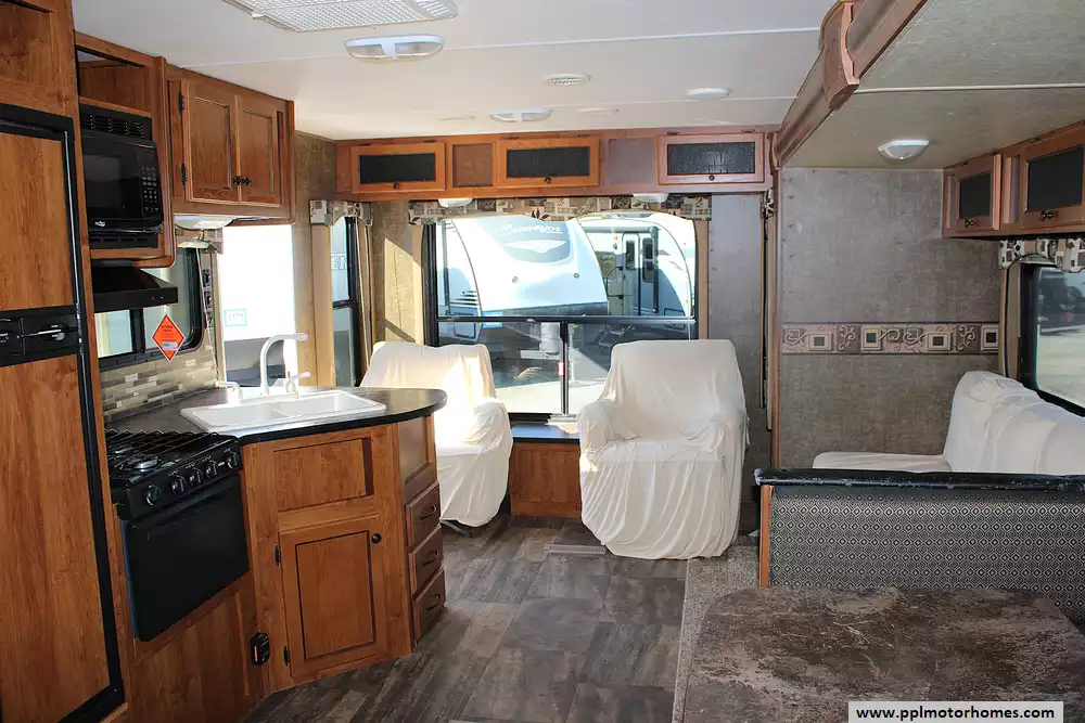 Inside, you'll find sleeping space for up to six people. The private front bedroom features a comfortable queen bed with ample storage, while the sofa and convertible dinette easily transform into additional sleeping areas for guests. The spacious rear lounge is perfect for unwinding after a long day, and the full kitchen includes a three-burner stove, oven, microwave, and double-door refrigerator-everything you need to prepare home-style meals on the road. A roomy bathroom with a walk-in shower adds convenience, while thoughtful details like overhead cabinetry and a warm decor give it a residential feel.