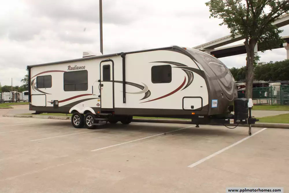 Externally, the Radiance 30RKSS presents a modern and aerodynamic profile, featuring sleek fiberglass sidewalls and eye-catching graphics. The unit is built on a sturdy steel frame, ensuring stability and durability while traveling. Upon entering the trailer, occupants are greeted with a spacious and well-appointed interior designed to maximize comfort and functionality. Features Include...Electric Tongue Jack, 1 Slide-out, 1 Ducted Air Conditioner, Double Door Gas/110v Refrigerator, Automatic Main Awning, 2 TVs, DVD Player, Outdoor Grill, Outdoor Kitchen, Microwave, 3 Burner Range, and Oven. the 2015 Radiance 30RKSS is a stylish and functional travel trailer that offers comfort and convenience for families or groups of travelers seeking a memorable camping experience. With its spacious layout, modern amenities, and thoughtful design, this Cruiser RV model provides a cozy and convenient home on wheels for outdoor enthusiasts.
