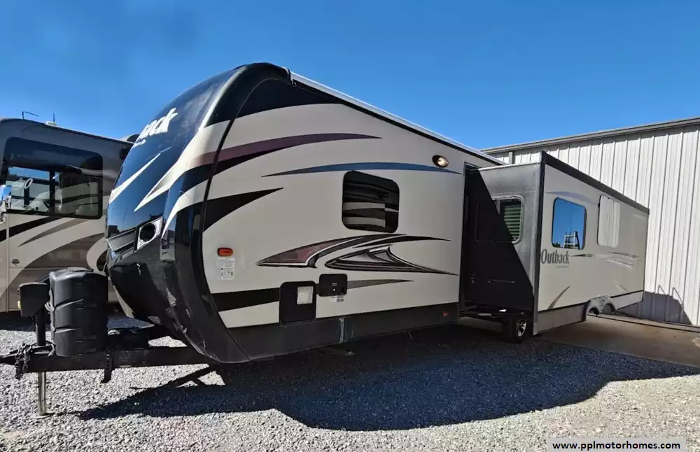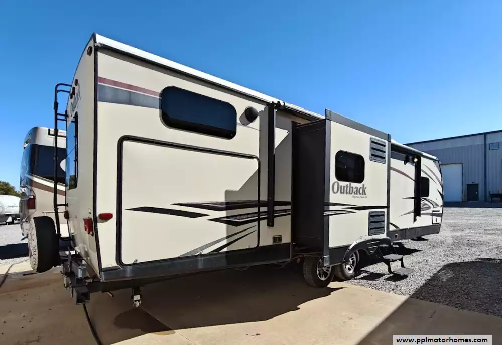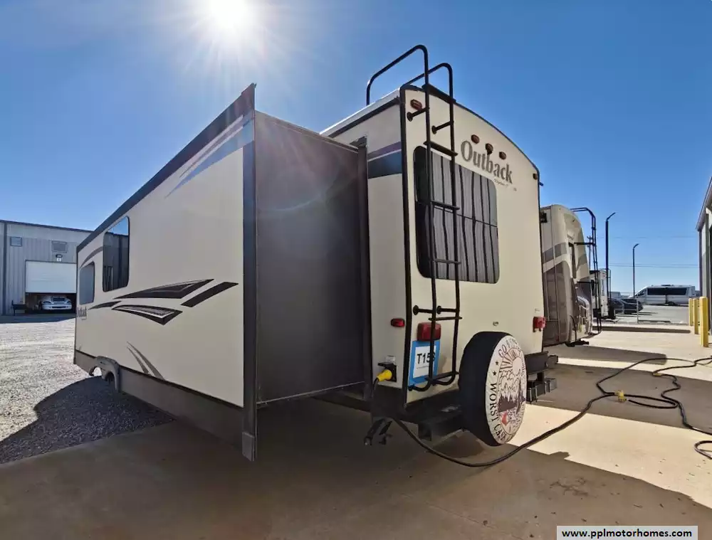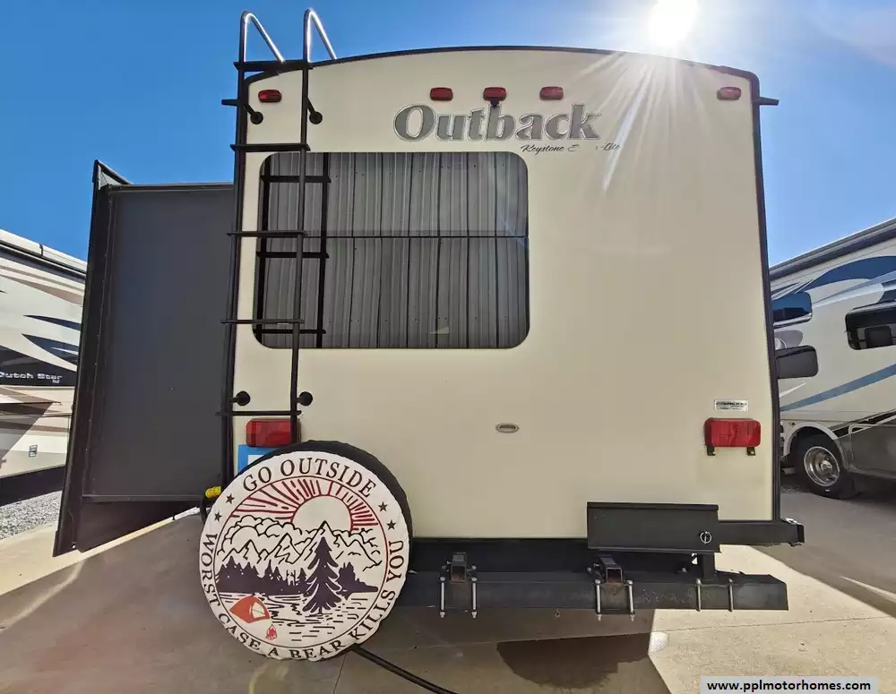 This 2015 Keystone Outback 323BH is a travel trailer with a bunkhouse floorplan designed to sleep up to 5 people. It features 2 slide-outs, a rear bunkhouse, and an Outdoor Kitchen which includes a Refrigerator, single sink, flip-out stove top, and a bumper-mount grill.The main living area features 2 TVs, a DVD Player and a Booth Dinette, which is located in a large slide-out to maximize space. A kitchen island offers extra counter space, a double sink, a Double Door Gas/110v Dometic Refrigerator and Microwave. The Outback is also built for four-season camping, with an enclosed and heated underbelly and insulated walls. It also includes an Electric Tongue Jack, 2 Slide-outs, 2 Ducted Air Conditioners, Automatic Main Awning, Outside Speakers and an Outside Shower.