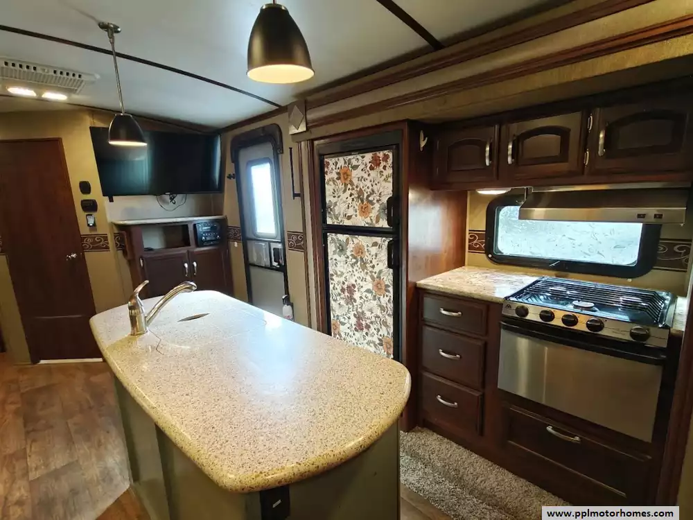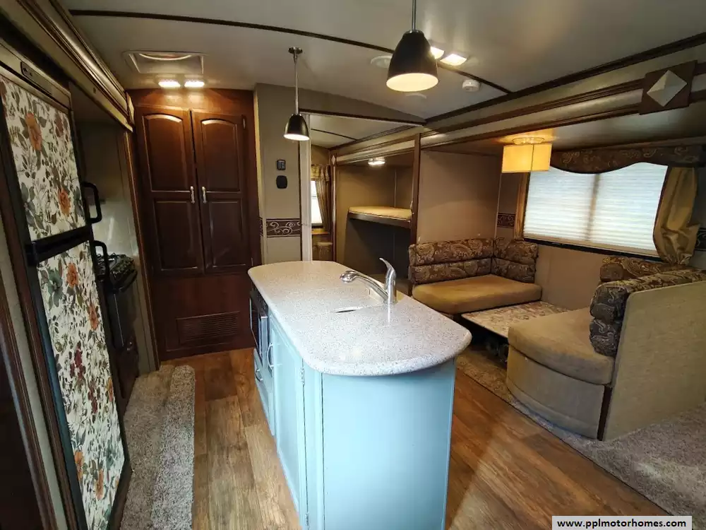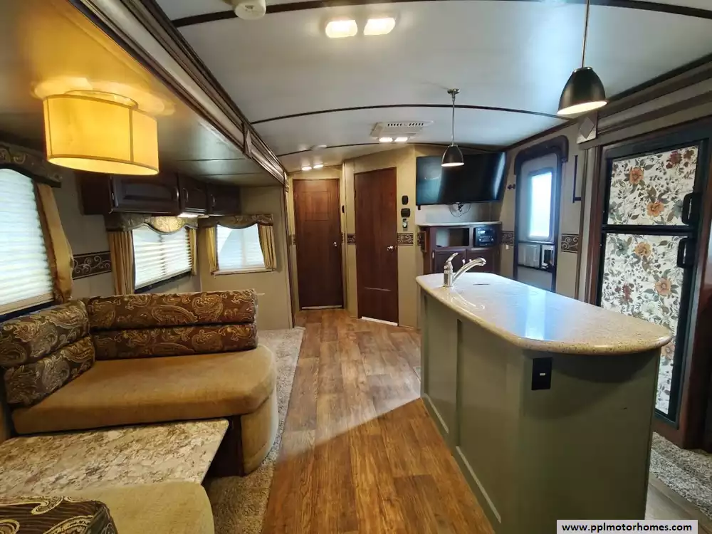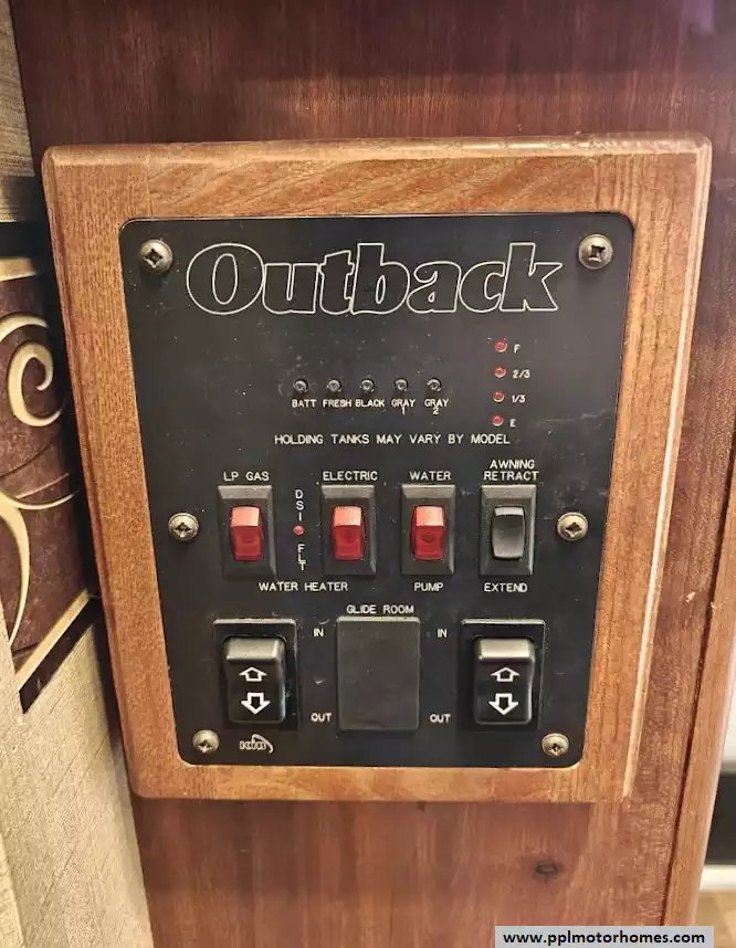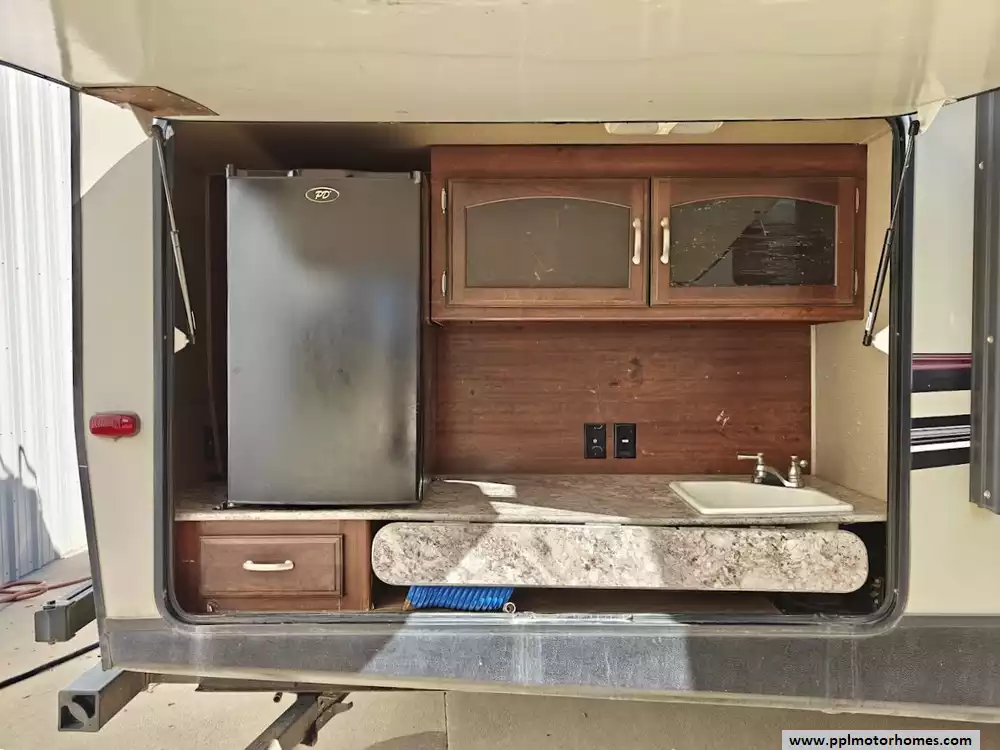 This 2015 Keystone Outback 323BH is a travel trailer with a bunkhouse floorplan designed to sleep up to 5 people. It features 2 slide-outs, a rear bunkhouse, and an Outdoor Kitchen which includes a Refrigerator, single sink, flip-out stove top, and a bumper-mount grill.The main living area features 2 TVs, a DVD Player and a Booth Dinette, which is located in a large slide-out to maximize space. A kitchen island offers extra counter space, a double sink, a Double Door Gas/110v Dometic Refrigerator and Microwave. The Outback is also built for four-season camping, with an enclosed and heated underbelly and insulated walls. It also includes an Electric Tongue Jack, 2 Slide-outs, 2 Ducted Air Conditioners, Automatic Main Awning, Outside Speakers and an Outside Shower.