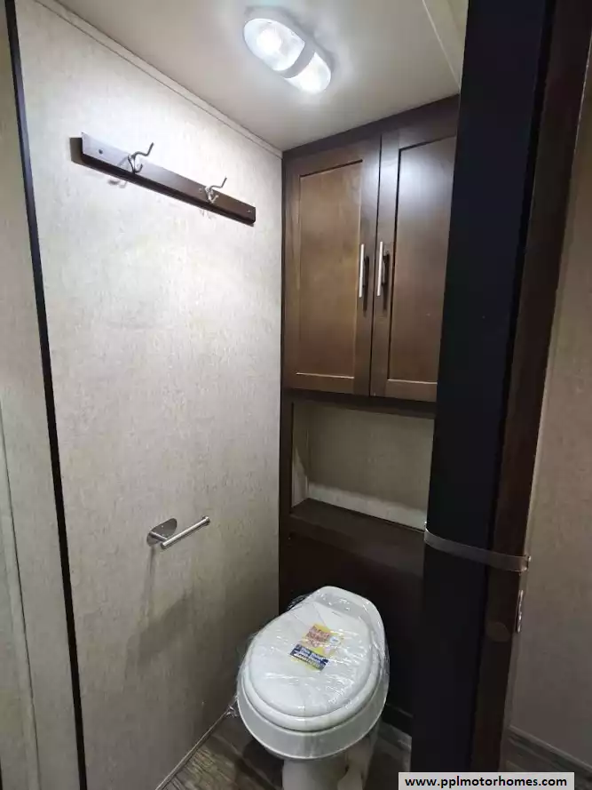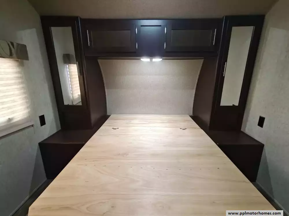 The bedroom is located at the front of the trailer and is designed as a private master suite. The room centers around a queen-size bed. A standout feature of this floor plan is a second exterior entry door that provides direct access from the outside into the bedroom. There is ample storage including dual mirrored wardrobes located on either side of the bed, cabinets above the headboard and underbed storage.
