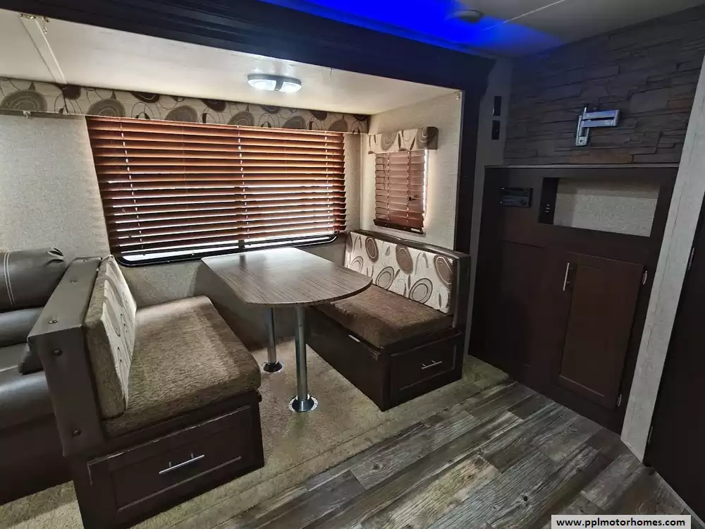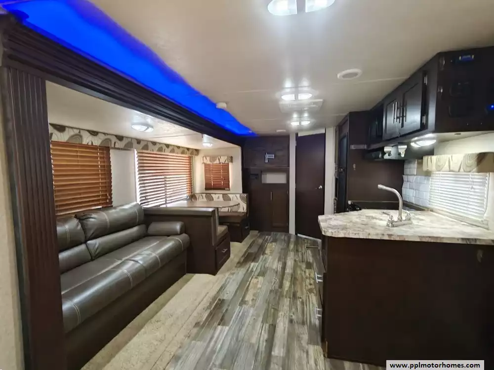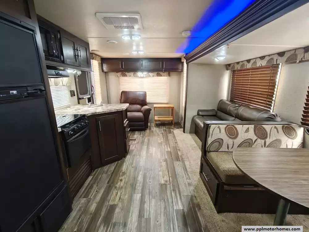 The 2016 Forest River Cherokee 264L is a rear-living travel trailer designed for couples or small families seeking a balance of comfort and towability. It features a spacious "super slide" and large floor-to-ceiling windows that create an open, residential feel.