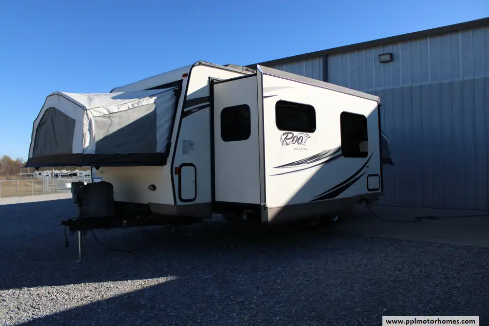 This 2016 Rockwood Roo 23IKSS has an Electric Tongue Jack, 2 Slide-outs, 1 Ducted Air Conditioner, Double Door Gas/110v Dometic Refrigerator, Automatic Main Awning, Outside Speakers, TV, Outside Shower, Microwave, 2 Burner Range, Oven