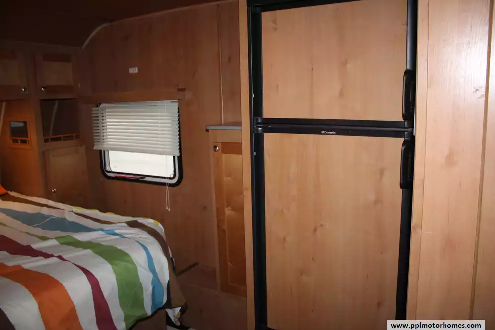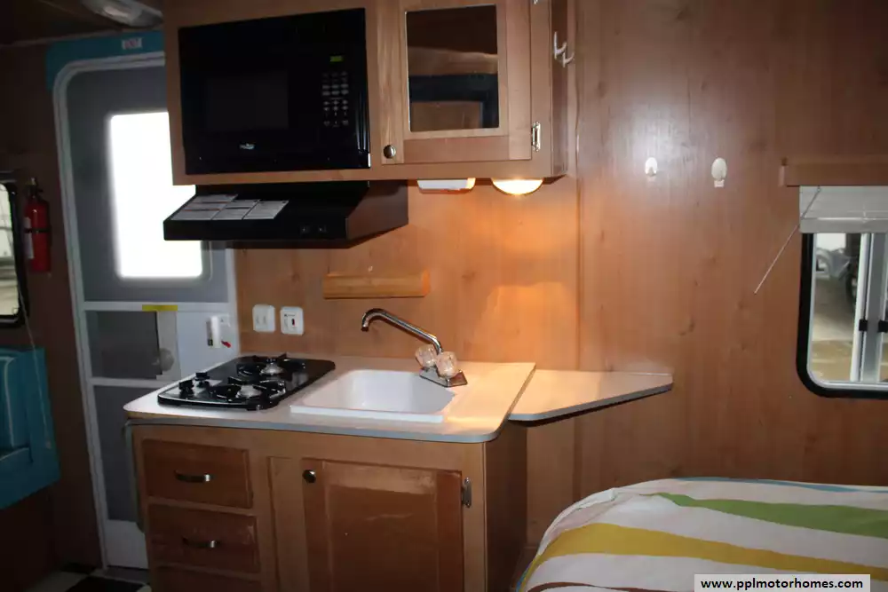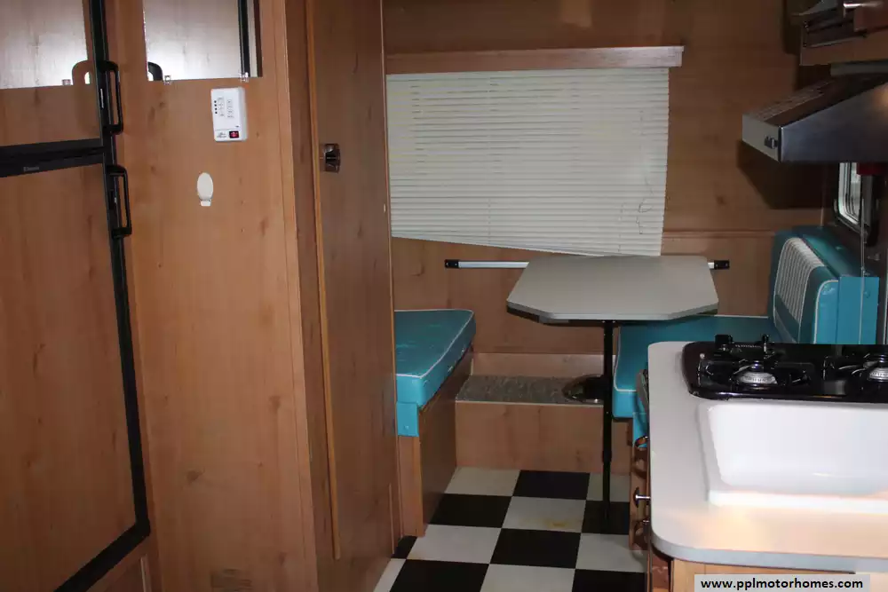 The 2016 Riverside RV White Water Retro 177SE is a compact, retro-styled travel trailer, roughly 18.5 to 19 feet long, designed to deliver full camper comforts in a towable size. It features a walk-around rear queen bed with memory-foam mattress, ample storage including wardrobes and overhead cabinets, a booth dinette up front (which converts to extra sleeping space), and a kitchenette equipped with a 2-burner stove, sink (plus a flip-up counter extension), microwave and a 6 cu ft gas/electric refrigerator. A full wet bath (shower/sink/toilet combo) gives you bathroom functionality while on the road. The trailer's wet bath and kitchen layout are surprisingly spacious for its size, and the interior embraces a retro-vintage look with birch-style walls and ceiling, checkered-flooring, and 1950s-era design cues. Overall, the 177SE strikes a balance of style, practicality, and compactness, ideal for couples (or a small family) wanting a comfortable, retro-stylized camper that's easy to tow and maneuver, without giving up key amenities like a full kitchen, bath, and a true queen bed.