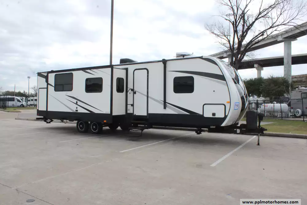 Specs: Length: 37.42 ft., Width: 8 ft., Height: 11.5 ft., Interior Height: 6.75 ft., Payload Capacity: 2,538 lbs., Total Fresh Water Tank Capacity: 46 gal., Total Gray Water Tank Capacity: 80 gal., Total Black Water Tank Capacity: 40 gal., Total Propane Tank Capacity: 40 lbs.