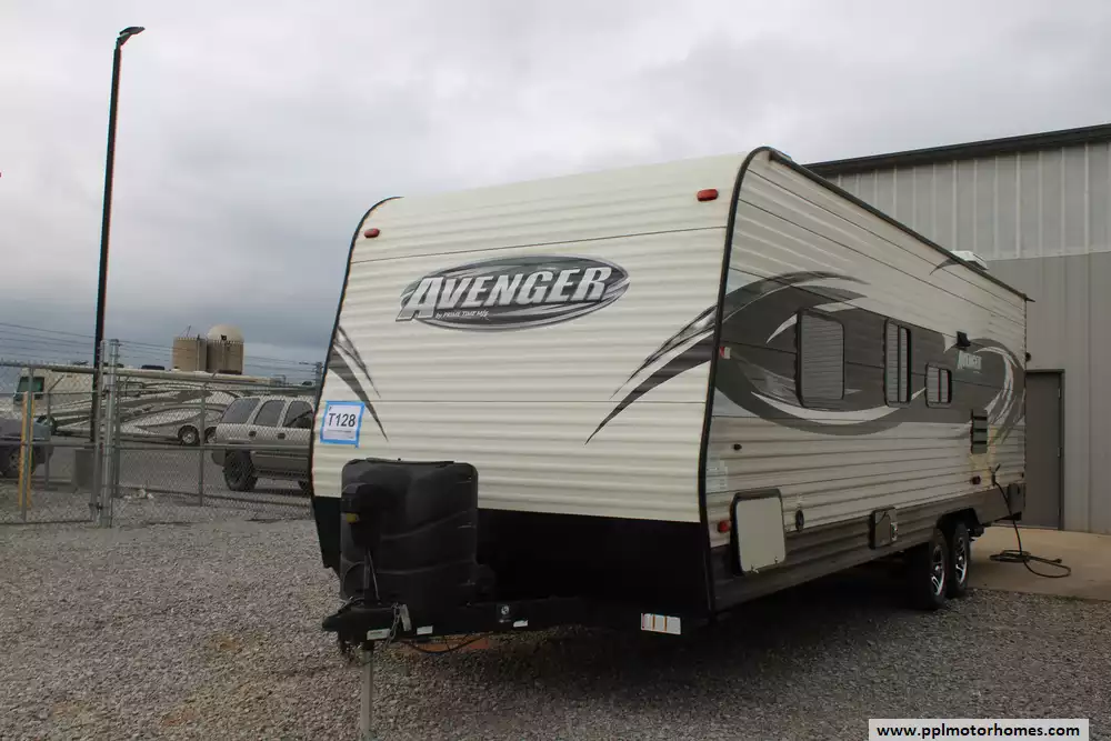 This 2017 Primetime Avenger 26BH has an Electric Tongue Jack, 1 Ducted Air Conditioner, Double Door Gas/110v Norcold Refrigerator, Automatic Main Awning, Outside Speakers, TV, Outside Shower, 3 Burner Range, Oven