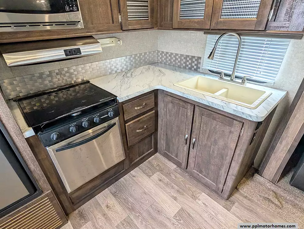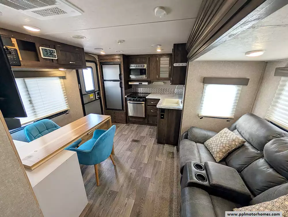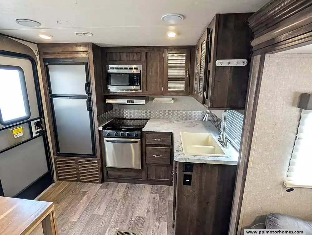 Experience the perfect balance of lightweight towing and residential comfort with this 2017 Vibe 258RKS. Renowned for its Extreme Lite construction, this 28-foot travel trailer features a high-gloss fiberglass body and a durable rubber roof, making it an ideal choice for travelers seeking fuel efficiency without sacrificing durability. The popular rear kitchen layout is the centerpiece of this model, providing an expansive workspace for the home chef with its three-burner range, oven, microwave, and a Dometic double-door gas/110v refrigerator. With two slide-outs and a barreled ceiling design, the interior feels remarkably open and inviting, offering a spacious retreat for relaxing after a day on the road.