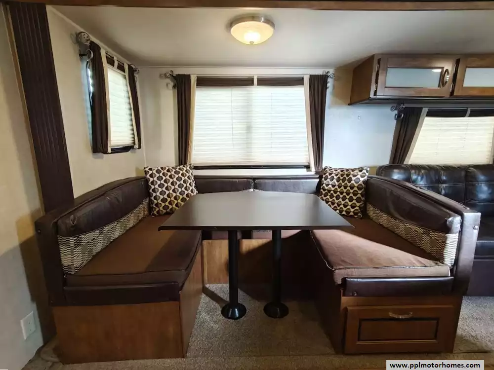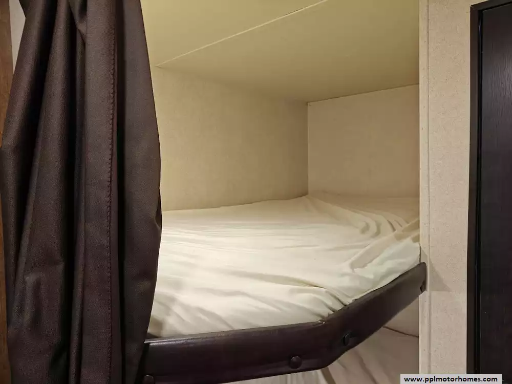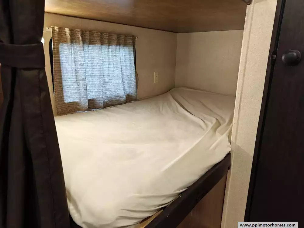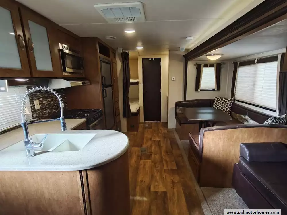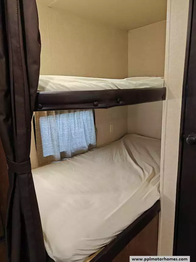The 2017 Forest River Wildwood 28DBUD is a bunkhouse-style travel trailer that is designed for families and features a large slide-out and sleeping capacity for up to 10 people. A large slide-out expands the living area, which includes a U-shaped dinette and a jack-knife sofa, both of which can convert into additional sleeping space. The rear features a set of stacked double bunks, providing a dedicated area for kids or guests. The kitchen is equipped with a double-door refrigerator, a three-burner high output range with oven, a microwave, and a high-rise faucet. The front bedroom includes a walk-around queen bed, mirrored wardrobes, and strut-lifted storage underneath the bed. A full bathroom that is conveniently located in the rear next to the bunk beds. A key feature of the layout is that the bathroom sink is separate from the main bathroom area, allowing multiple people to get ready at the same time. The exterior comes with a power awning, exterior speakers, a power tongue jack, and pass-through storage.