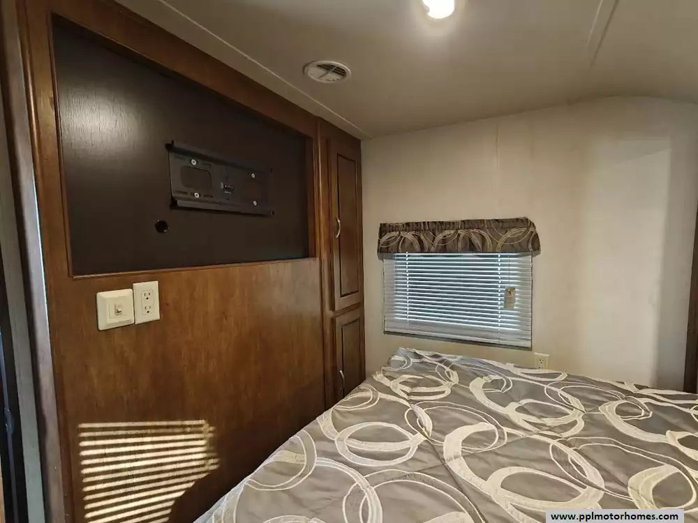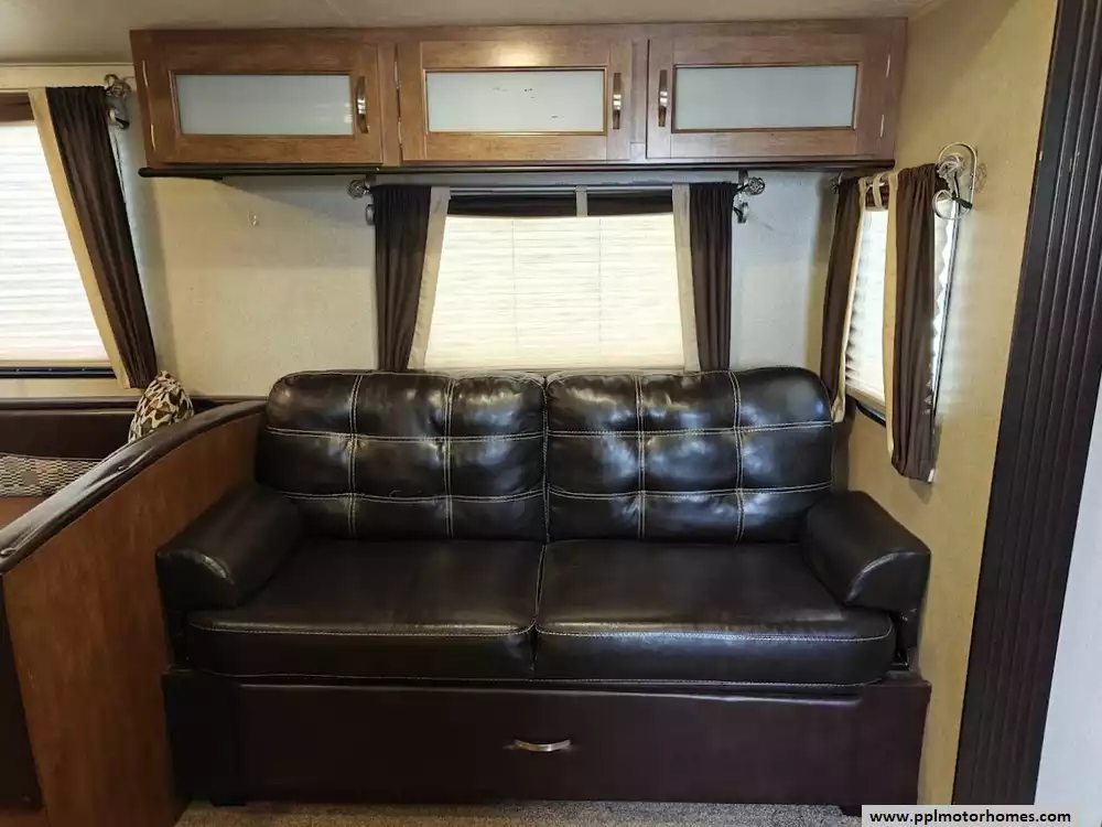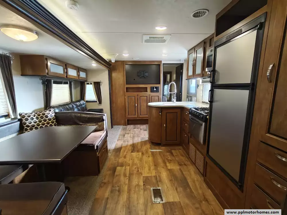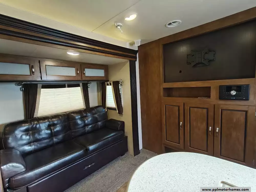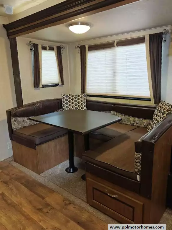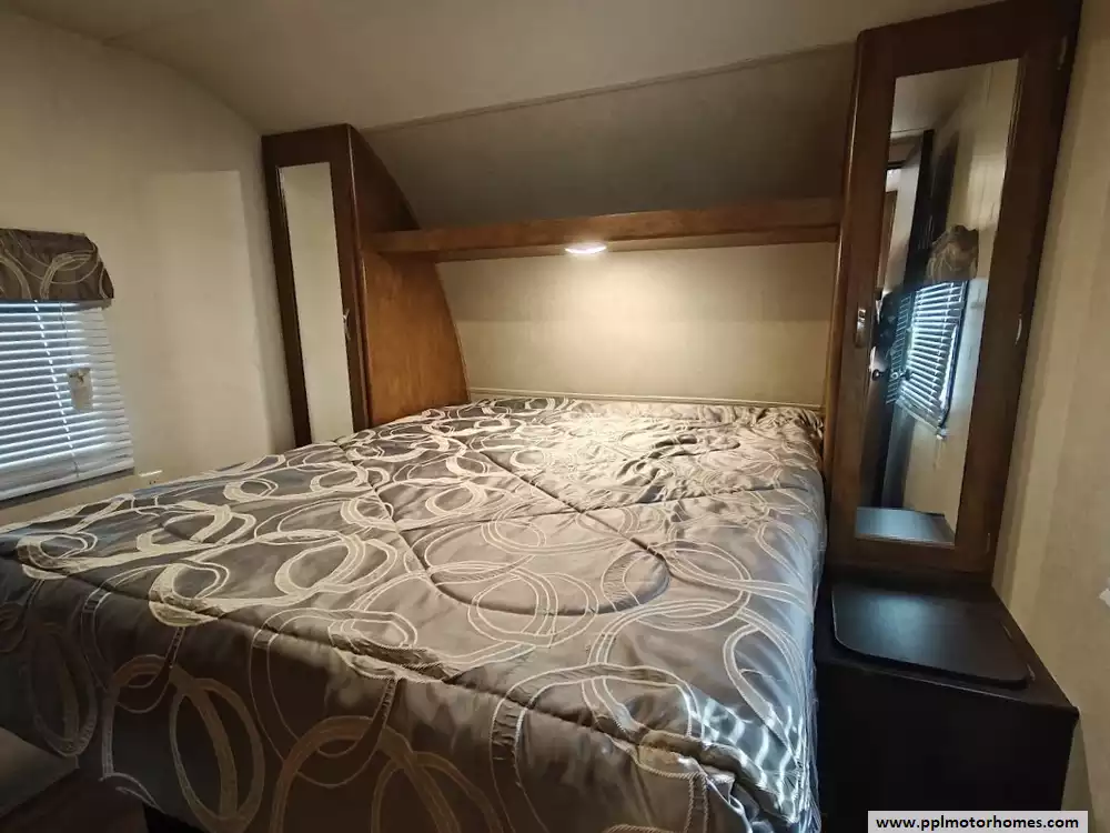 The 2017 Forest River Wildwood 28DBUD is a bunkhouse-style travel trailer that is designed for families and features a large slide-out and sleeping capacity for up to 10 people. A large slide-out expands the living area, which includes a U-shaped dinette and a jack-knife sofa, both of which can convert into additional sleeping space. The rear features a set of stacked double bunks, providing a dedicated area for kids or guests. The kitchen is equipped with a double-door refrigerator, a three-burner high output range with oven, a microwave, and a high-rise faucet. The front bedroom includes a walk-around queen bed, mirrored wardrobes, and strut-lifted storage underneath the bed. A full bathroom that is conveniently located in the rear next to the bunk beds. A key feature of the layout is that the bathroom sink is separate from the main bathroom area, allowing multiple people to get ready at the same time. The exterior comes with a power awning, exterior speakers, a power tongue jack, and pass-through storage.