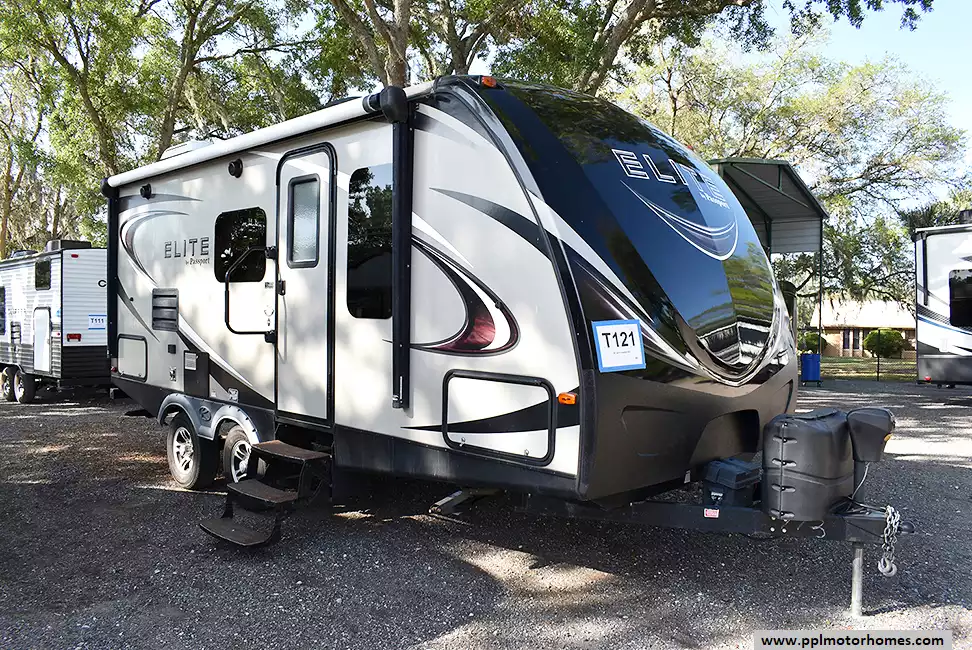 This 2017 Passport 19RB has an Electric Tongue Jack, 1 Non-Ducted Air Conditioner, Double Door Gas/110v Dometic Refrigerator, Automatic Main Awning And Door Awning, Satellite Receiver, Outside Stereo, TV, DVD Player, Outside Shower, Microwave, 3 Burner Range