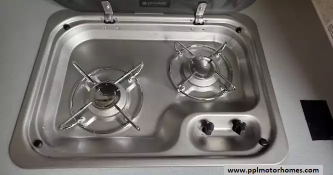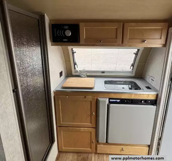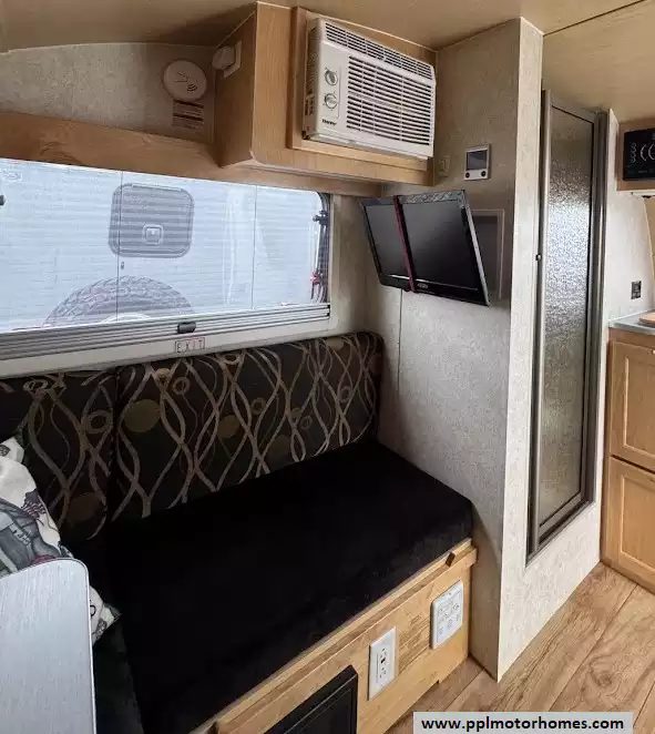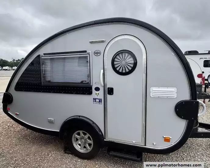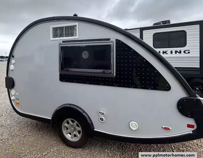 This 2017 T@B 320-S has a Window A/C, Single Door Gas Norcold Refrigerator, TV, 2 Burner Range, Spare Tire, Indoor Shower, Indoor Kitchen, New CO2 Detector
