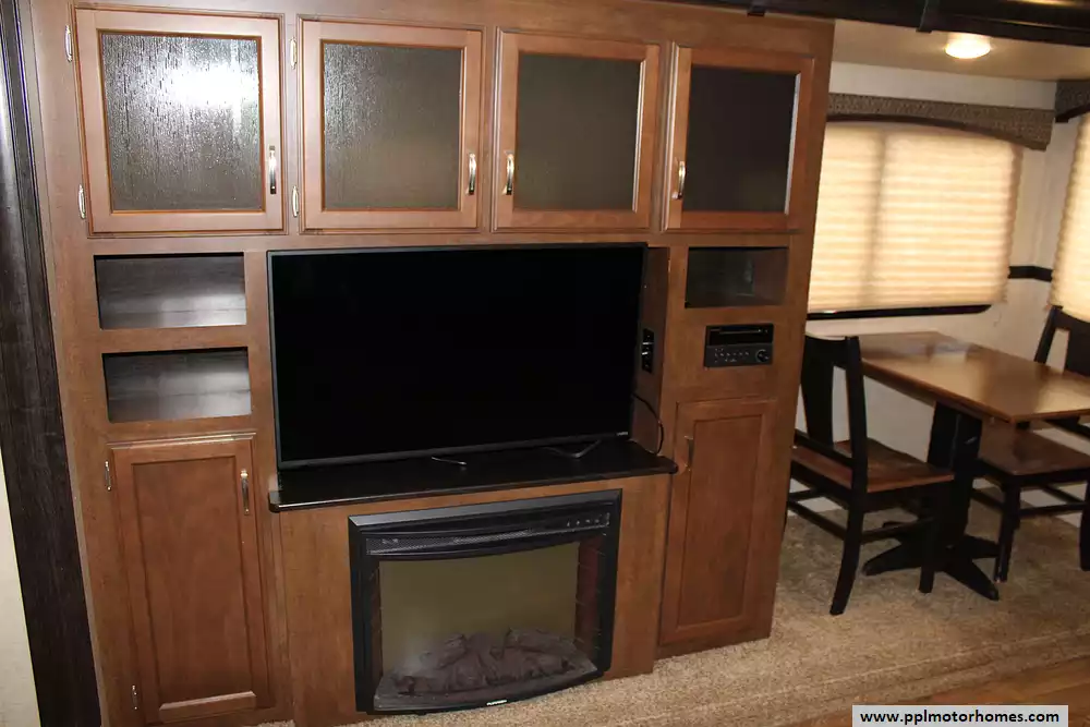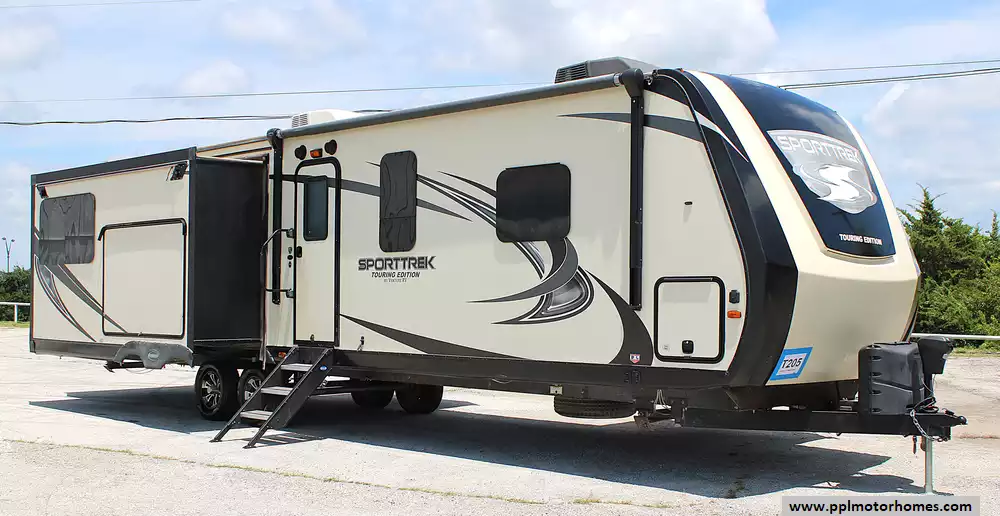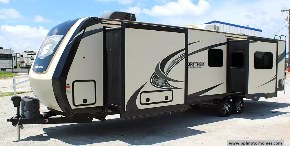 2017 Venture RV SportTrek Touring Edition STT336VRK is a high-end, triple-slide travel trailer that blends residential comfort with upscale style. Designed for extended stays or full-time living, it sleeps up to 4 and features a private front king bedroom with an abundance of wardrobe storage. The rear gourmet kitchen offers solid-surface counters, stainless appliances, and plenty of prep space. A brand-new Smart TV has been added to the spacious living area, which also includes a free-standing dinette, cozy theater seating, and an electric fireplace for a true home-away-from-home feel. A new battery and a striking full fiberglass front cap complete the look.