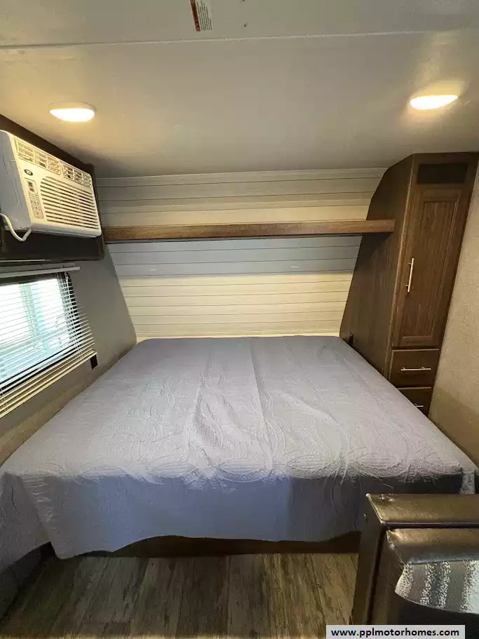 The front of the trailer is dedicated to sleeping, featuring an RV queen-size bed with overhead storage and wardrobes on either side.