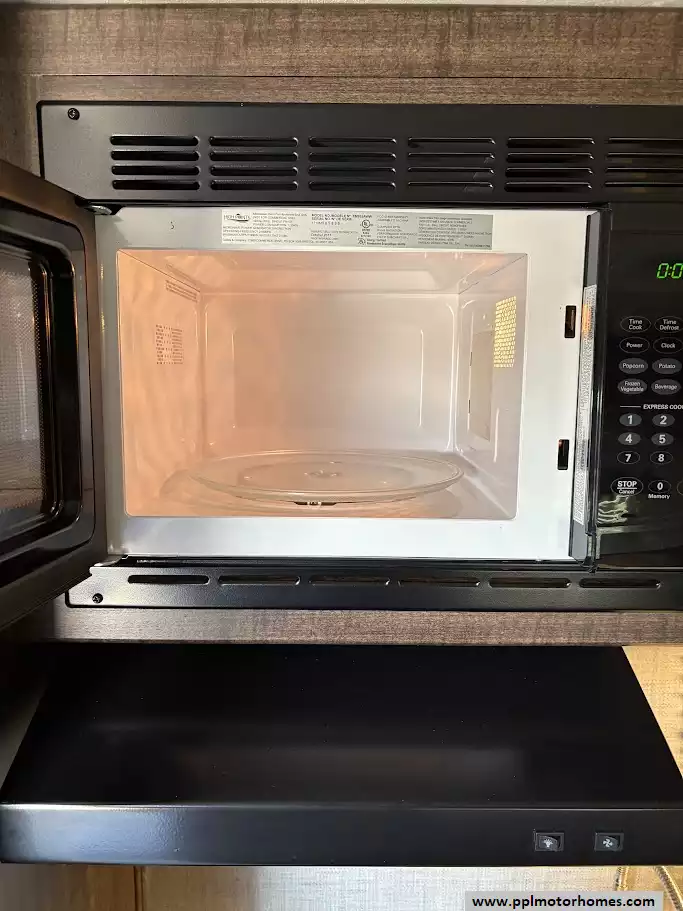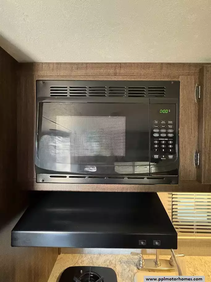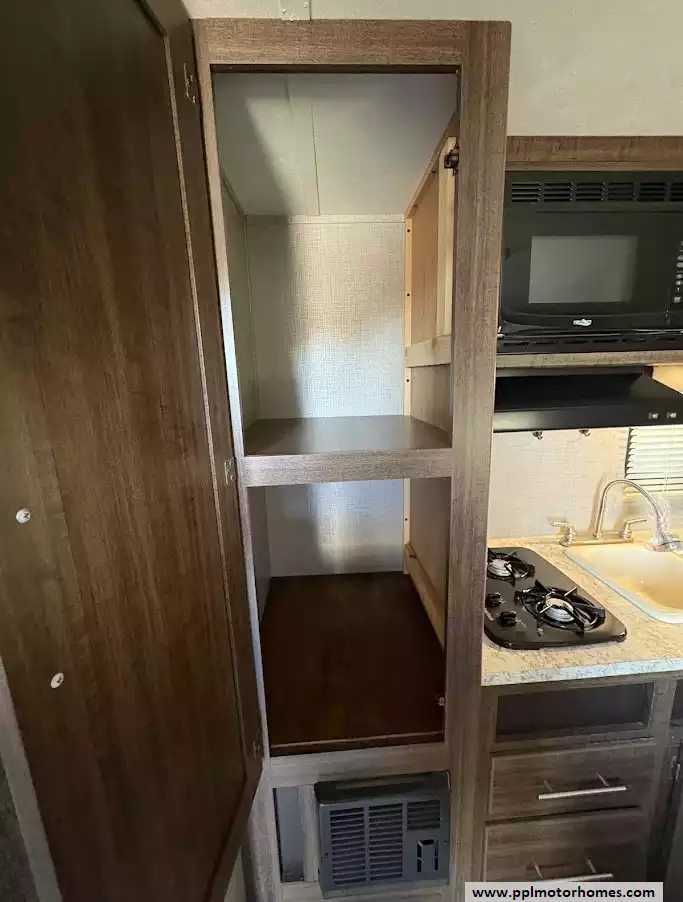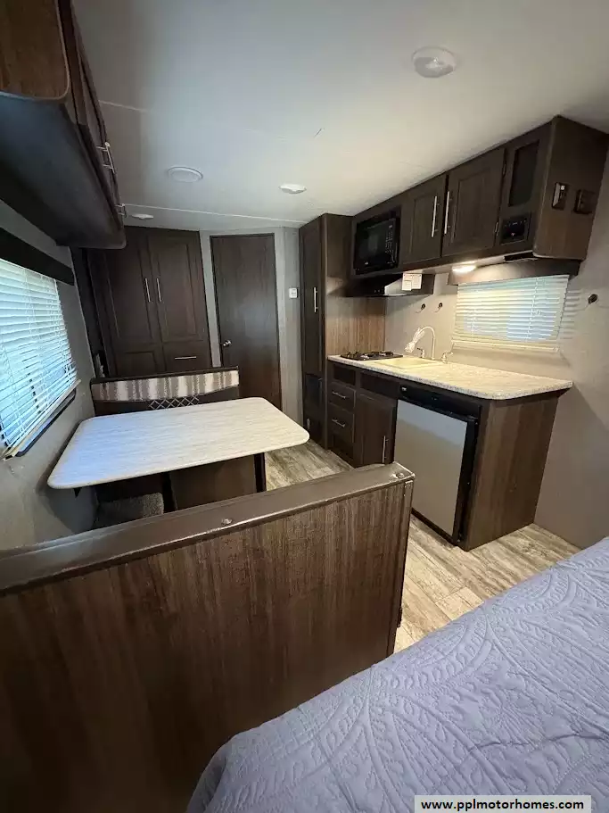The middle section includes a booth dinette on one side (which can be converted into additional sleeping space) and the kitchen amenities opposite it, which feature a two-burner cooktop, microwave, and a 12V refrigerator.