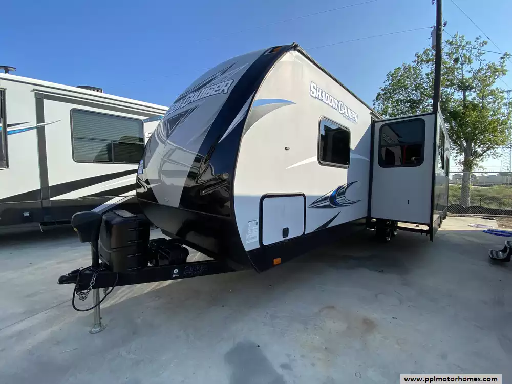 This 2018 Shadow Cruiser 260RBS has an Electric Tongue Jack, 1 Slide-out, 2 Ducted Air Conditioners, Double Door Gas/110v Dometic Refrigerator, Automatic Main Awning, Outside Speakers, TV, DVD Player, Outside Shower, Microwave, 3 Burner Range, Oven, Electric Front and Rear Stabilizer Jacks
