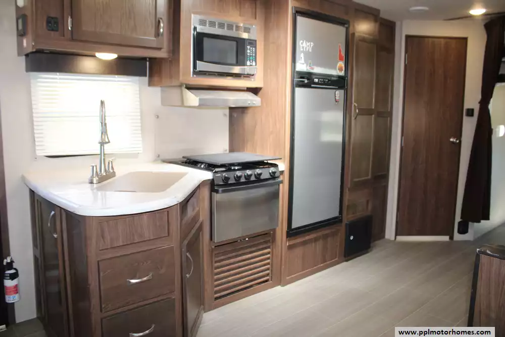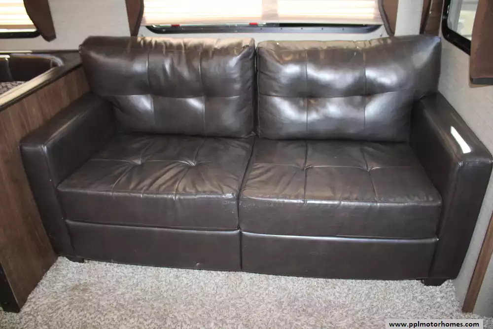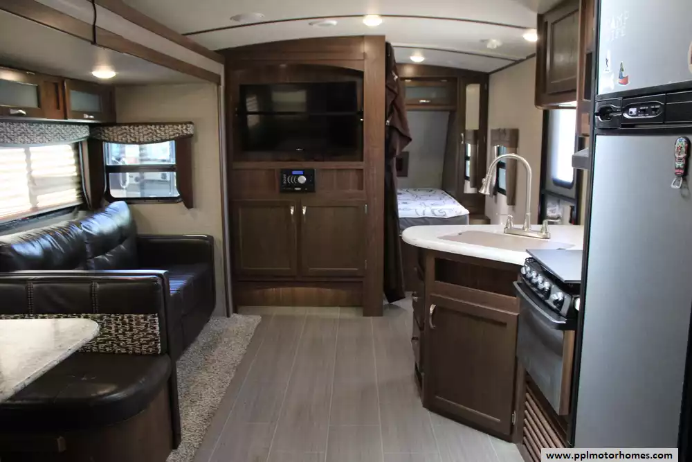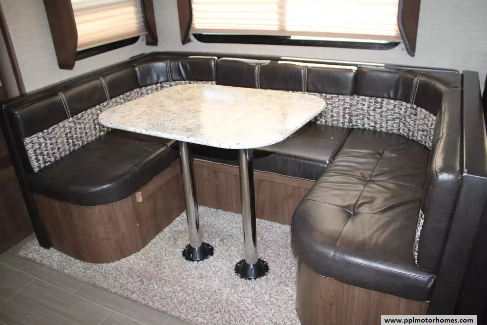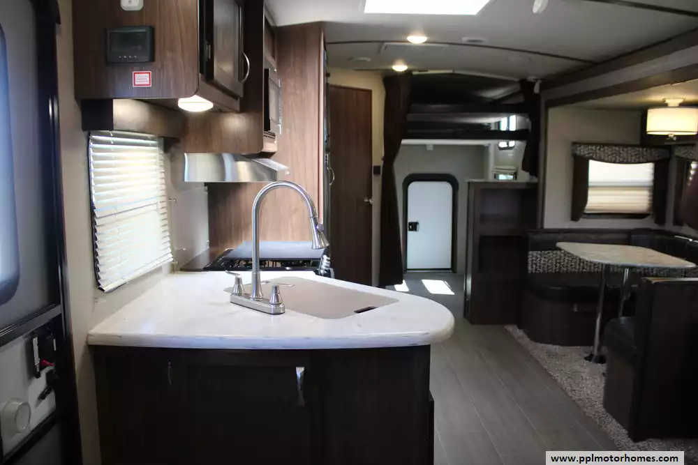 The 2018 Dutchmen Aerolite Luxury 282DBHS is a spacious and family-friendly travel trailer designed to provide comfort and functionality while remaining relatively lightweight for its size. Measuring about 33 feet in length with one slide-out and a dry weight of around 6,300 pounds, this bunkhouse model can sleep up to nine people, making it ideal for families or group camping trips. The layout features a private front bedroom with a king-size bed, a large U-shaped dinette and sofa in the slide-out living area, and rear bunk beds that maximize sleeping capacity. The kitchen is equipped with solid-surface countertops, a three-burner cooktop, microwave, double-door refrigerator, and ample cabinetry for storage. A rear bathroom with a tub/shower combo and a separate exterior entry door adds convenience, while additional features such as a power awning, LED lighting, exterior speakers, and large holding tanks make the Aerolite 282DBHS a comfortable and practical travel trailer for both weekend getaways and extended camping trips.