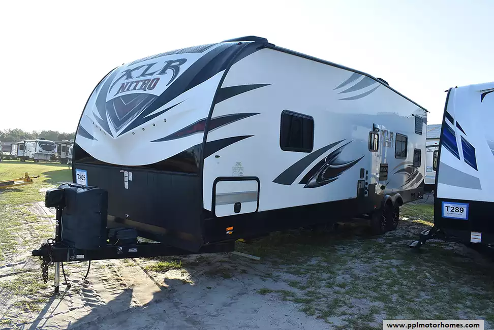 This 2018 Nitro 28KW has an Electric Tongue Jack, Onan Gas Generator, 2 Ducted Air Conditioners, Double Door Gas/12v Dometic Refrigerator, Automatic Main Awning, Heated Tanks, Outside Speakers, TV, Outside Shower, Microwave, 3 Burner Range, Oven