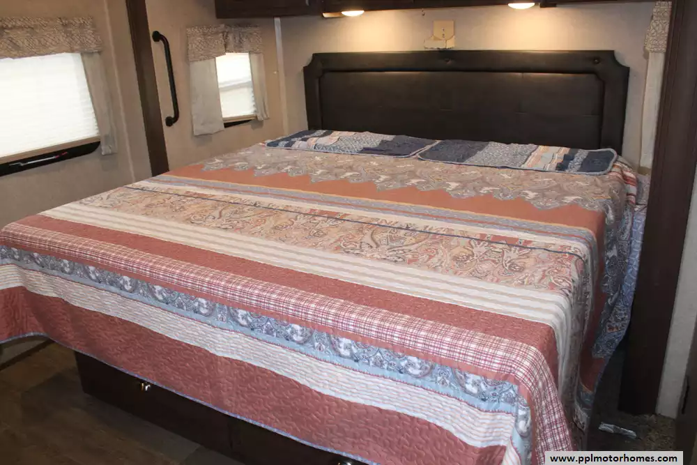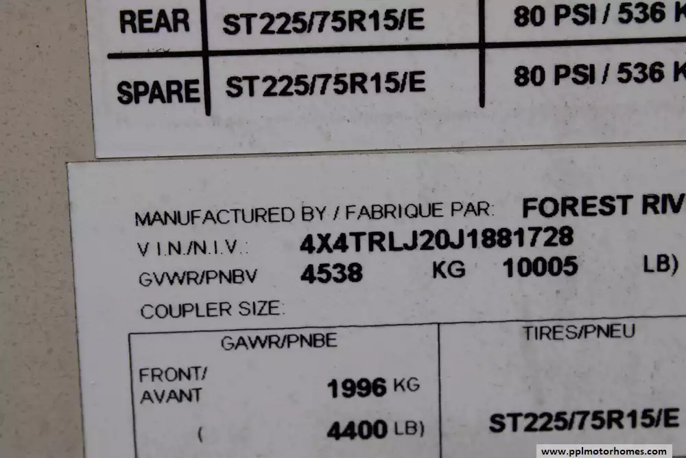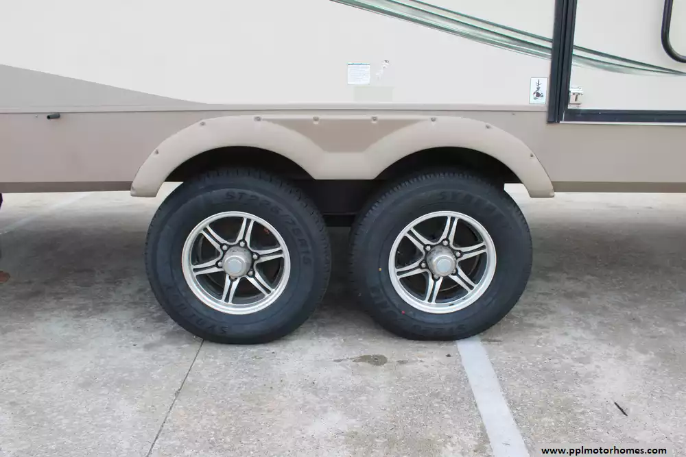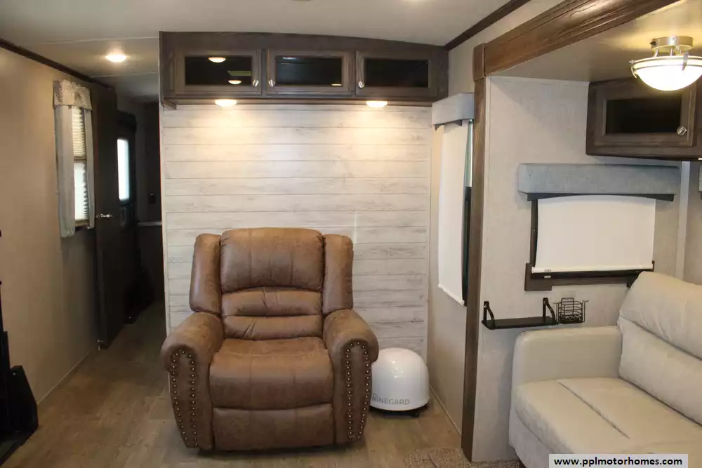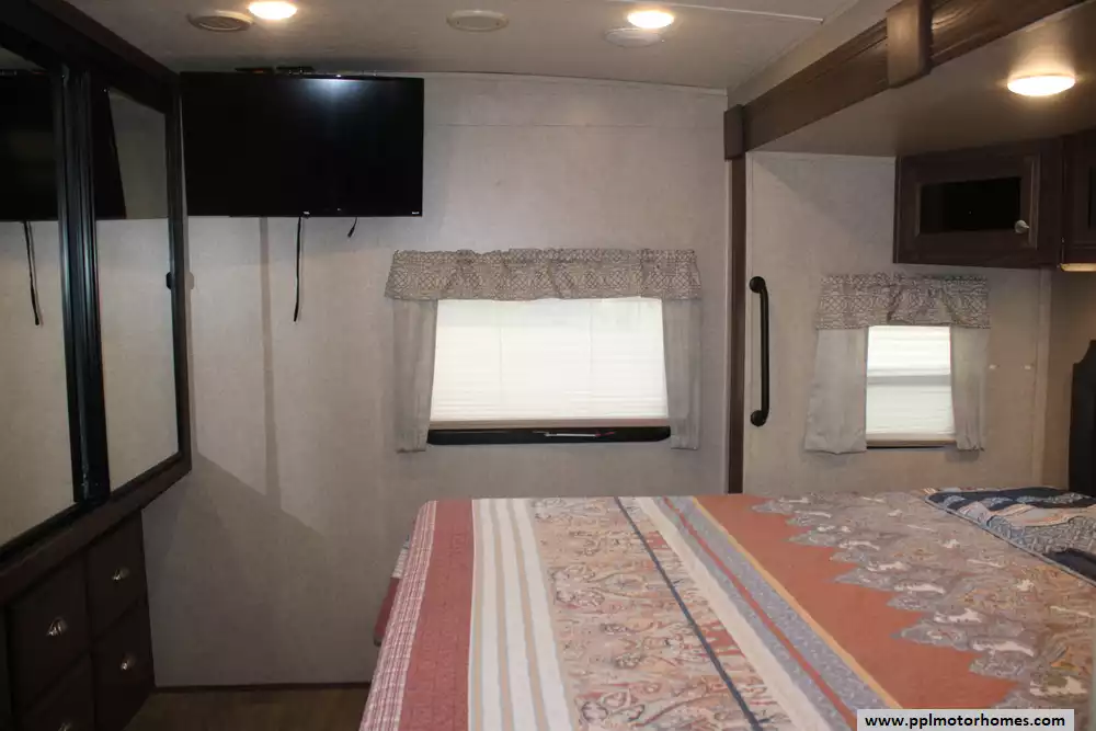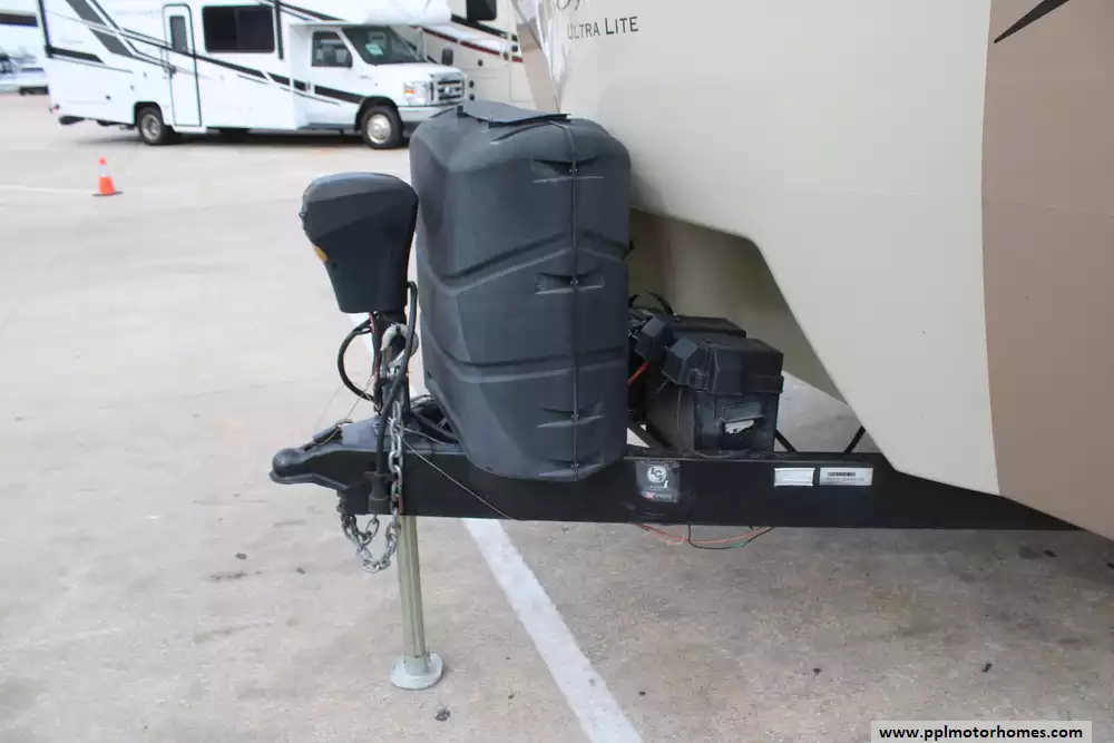 Specs: Length: 35.11 ft., Width: 8 ft., Height: 11.33 ft., Payload Capacity: 1,900 lbs., Total Fresh Water Tank Capacity: 45 gal., Total Grey Tank Capacity: 90 gal., Total Black Water Tank Capacity: 45 gal., Total Propane Tank Capacity: 60 lbs.