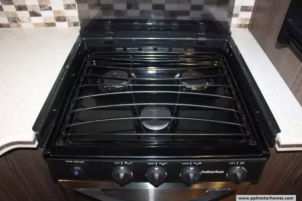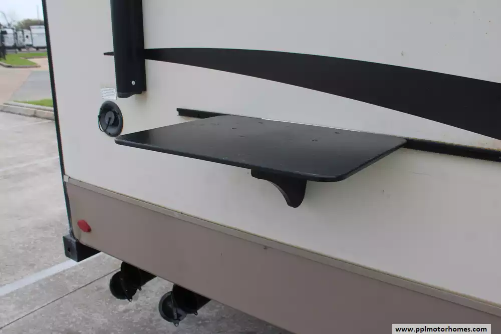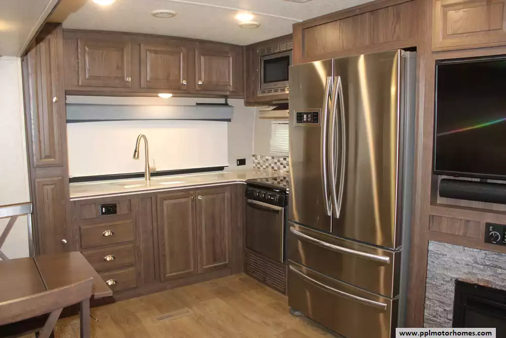 This well-appointed unit is fully equipped for extended stays and effortless outdoor entertaining. The kitchen is a chef's delight, featuring a massive four-door 110v residential Insignia refrigerator, a microwave, a three-burner range, and an oven. Transitioning to the outdoors is seamless with an automatic main awning, outside speakers, an outdoor grill, and an outside shower for easy cleanup. Setting up camp is a breeze thanks to the electric tongue jack, allowing you to spend less time on logistics and more time enjoying the premium features that have made the Rockwood Signature series a leader in the lightweight luxury market.