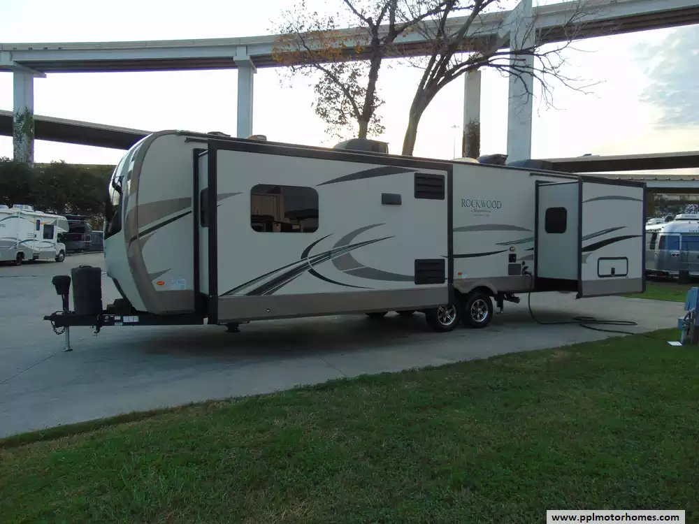 This 2018 Rockwood Signature Ultra Lite 8324BS is a luxurious travel trailer designed for couples or small families seeking comfort and high-end features in a lightweight package.It offers a spacious layout and premium amenities,making it perfect for extended trips or weekend getaways.Features Include...Electric Tongue Jack, 3 Slide-outs, 2 Ducted Air Conditioners,Double Door Gas/110v Dometic Refrigerator, Automatic Main Awning And Window Awning, Outside Speakers,TV,Outdoor Kitchen, Outside Shower,Fireplace,Microwave,3 Burner Range,and Oven.It delivers a perfect blend of luxury,space,and lightweight towing for a premium RVing experience.