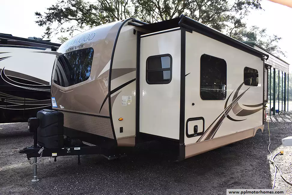This 2018 Rockwood Ultra Lite 2608SB has an Electric Tongue Jack, 2 Slide-outs, 1 Ducted Air Conditioner, Double Door Gas/110v Refrigerator, Automatic Main Awning And Slide Awning, Heated Tanks, Outside Speakers, 2 TVs, Outside Shower, Microwave, 3 Burner Range, Oven