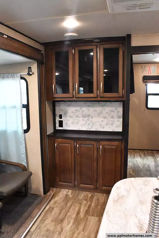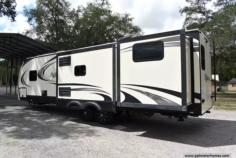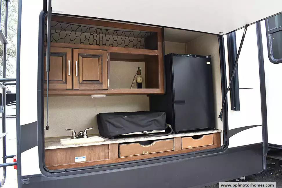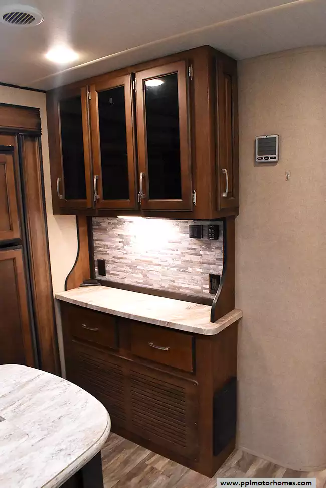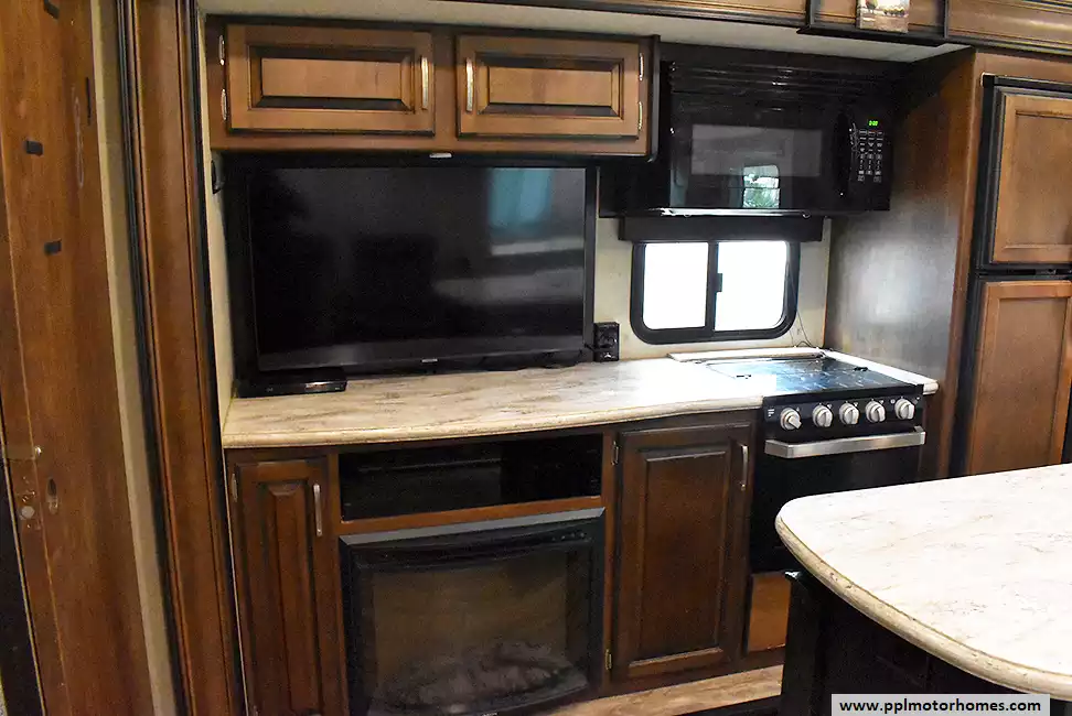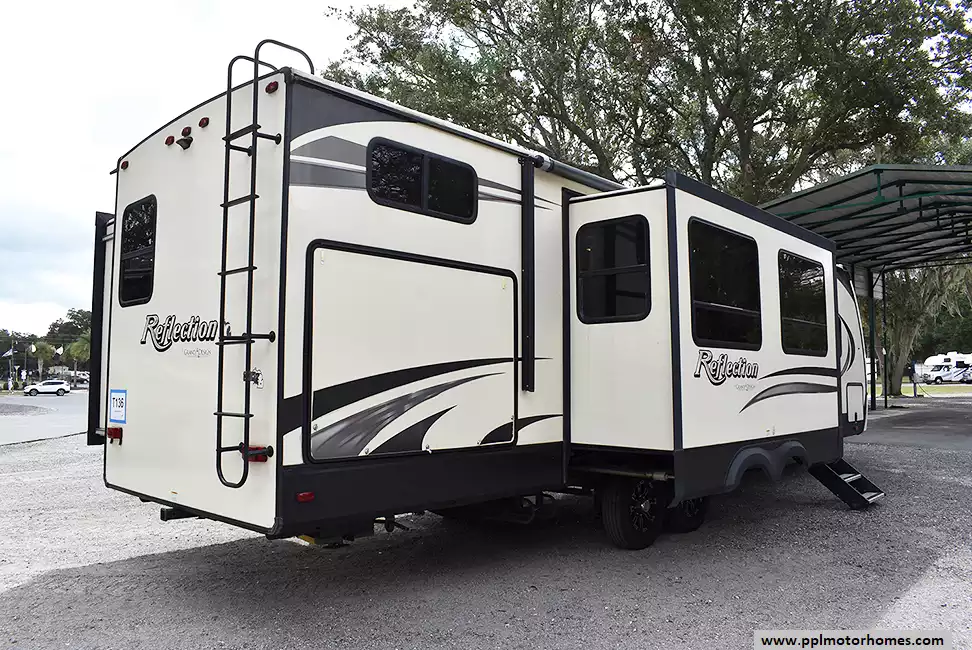 This 2018 Reflection 312BHTS has an Electric Tongue Jack, 3 Slide-outs, 2 Ducted Air Conditioners, Gas/110v Dometic Refrigerator, Automatic Main Awning, Solar Panel, Heated Tanks, Outside Speakers, 3 TVs, DVD Player, Outdoor Grill, Outdoor Kitchen, Fireplace, Convection Microwave, 3 Burner Range, Oven