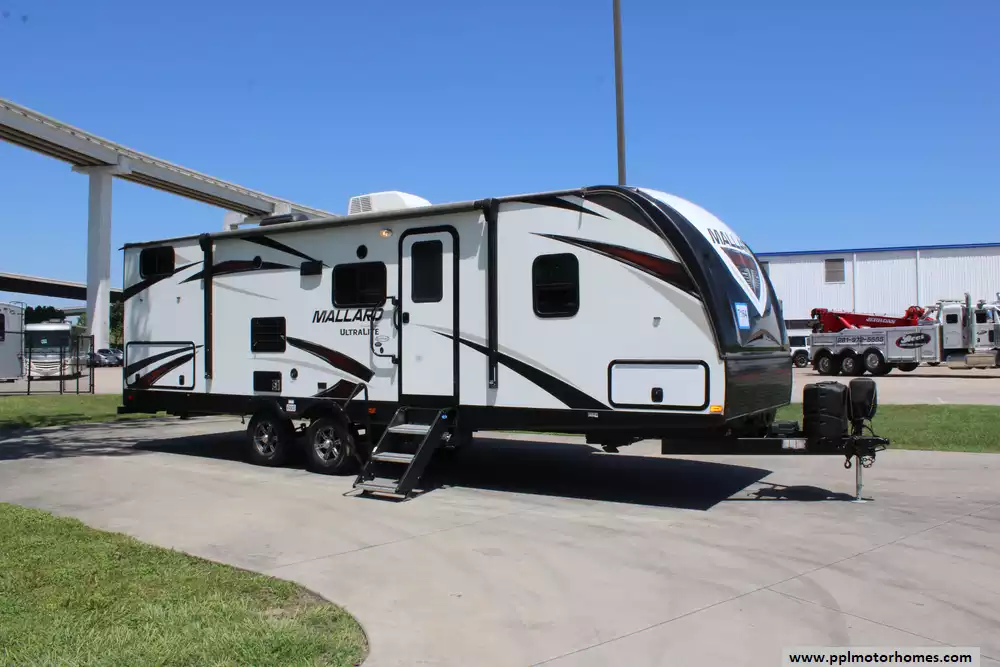 This 2018 Mallard by Heartland 26 is a lightweight, travel trailer designed for families and couples who want a spacious, comfortable, and easy-to-tow RV. Features Include...Electric Tongue Jack, 1 Slide-out, 1 Ducted Air Conditioner, Double Door Gas/110v Dometic Refrigerator, Automatic Main Awning, Outside Speakers, TV, Outdoor Kitchen, Outside Shower, Microwave, 3 Burner Range, and Oven. The 2018 Heartland Mallard M26 is an excellent choice for small families and couples looking for a lightweight, easy-to-tow travel trailer with plenty of space and modern features. Its spacious slide-out, private bedroom, and full rear bathroom make it a great home away from home for camping and road trips.