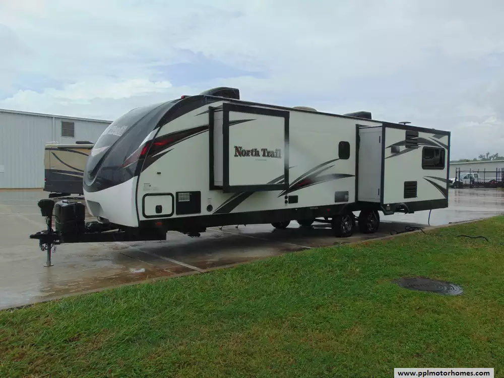 This 2018 North Trail Caliber 29RETS is a sleek and spacious travel trailer designed for RVers who value comfort,style,and ease of towing.Its lightweight construction and aerodynamic profile make it a popular choice for both weekend getaways and extended road trips.Features Include...Electric Tongue Jack, 3 Slide-outs, 1 Non-Ducted And 1 Ducted Air Conditioner, Double Door Gas/110v Refrigerator, Automatic Main Awning,Back Up Camera and Monitor,Lippert Steps, Outside Speakers, TV, DVD Player, Outside Shower, Central Vacuum, 3 Burner Range,and Oven.It combines stylish design,comfortable living spaces,and practical features,making it a great option for travelers looking for a reliable and well-equipped travel trailer.