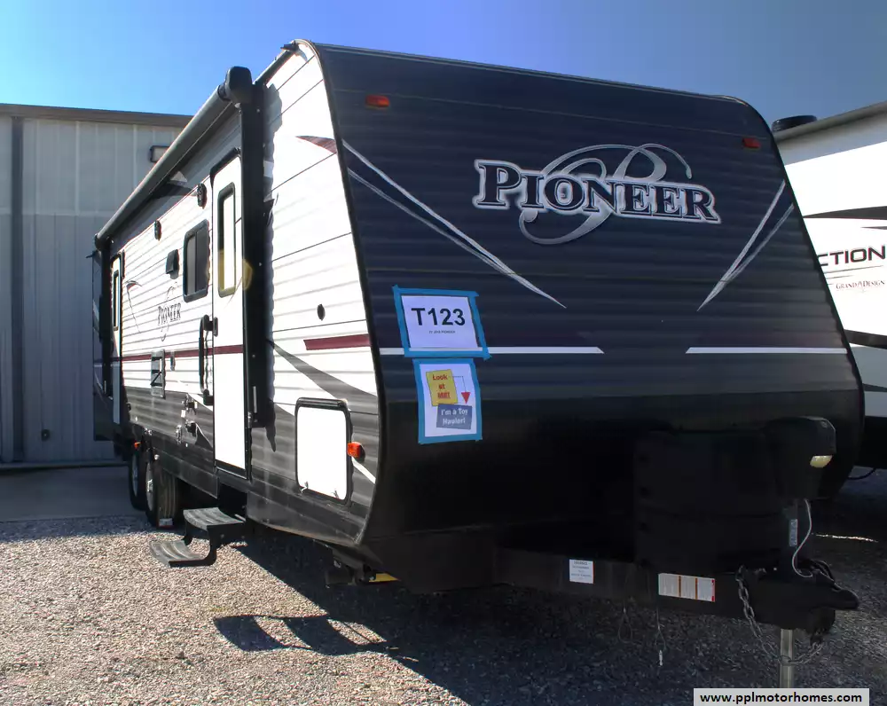 This 2018 Pioneer by Heartland RG28 equipped with a toy hauler is perfect for the whole family! This trailer also has an Electric Tongue Jack, 1 Slide-out, 1 Ducted Air Conditioner, Double Door Gas/110v Dometic Refrigerator, Automatic Main Awning, Outside Speakers, Outside Shower, Microwave, 3 Burner Range, and an Oven. Take to the road with your toys and family! Visit PPL Motorhomes in EL Reno Oklahoma TODAY!!!