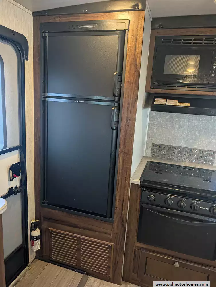 This unit is loaded with premium features to make life on the road effortless, including an electric tongue jack, an automatic main awning, and an outside shower for quick clean-ups. The interior is designed for modern convenience, featuring a central vacuum system, ducted air conditioning, and a fully equipped kitchen with a three-burner range, oven, microwave, and a double-door Dometic gas/110v refrigerator. Whether you are unwinding with the dual TVs and outside speakers or enjoying the private bedroom, this Wilderness Ultralight delivers a high-end camping experience in a towable, lightweight package.